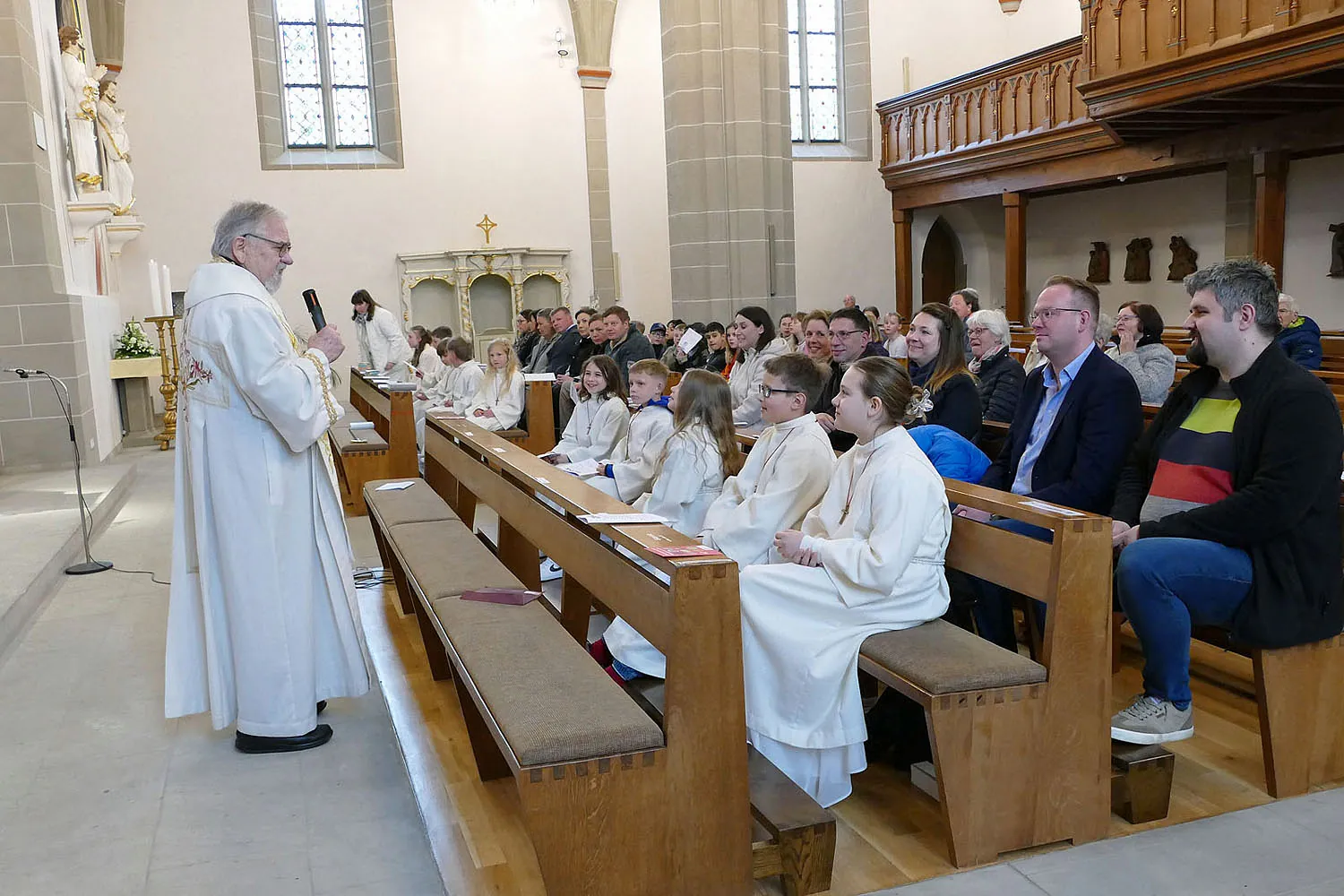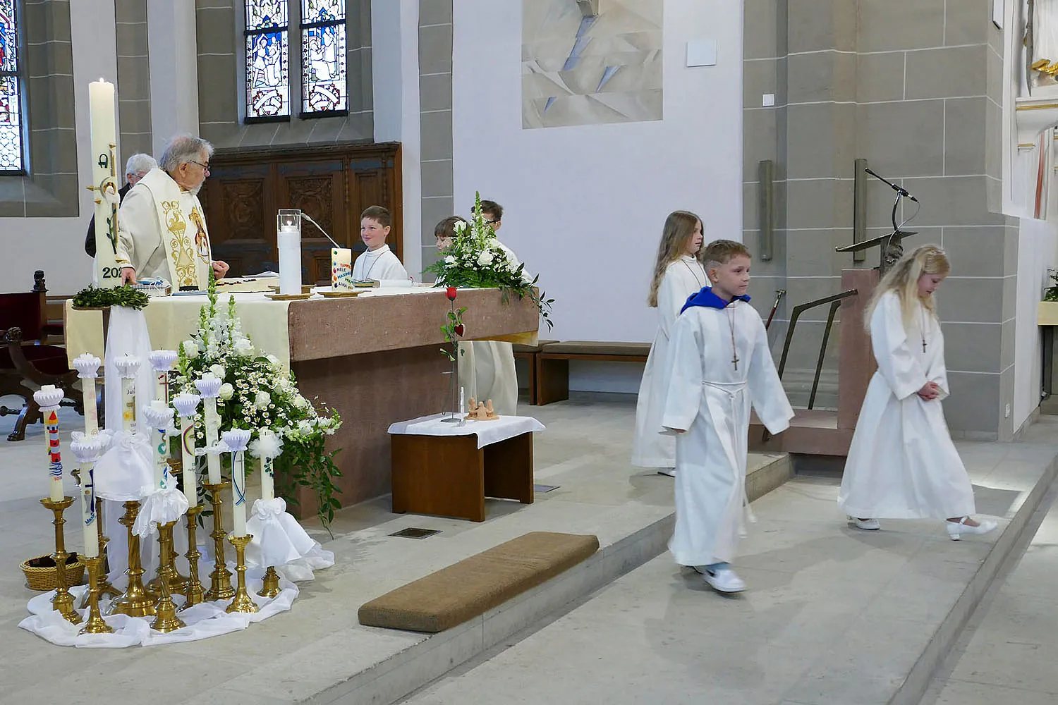 Stadtpfarrer i.R. Geistlicher Rat W.Johannes Kowal begrüßte die Kommunionkinder und ihre Angehörigen auf das Herzlichste und befragte sie, wie sie den gestrigen Tag, den Tag ihrer 1. Heiligen Kommunion, erlebt haben. Auch begrüßte er die Schulkameraden/dinnen der Erstkommunionkinder aus den Klasse 3B aus der Naumburger Elbetalschule.