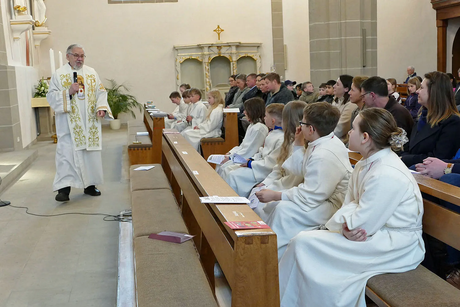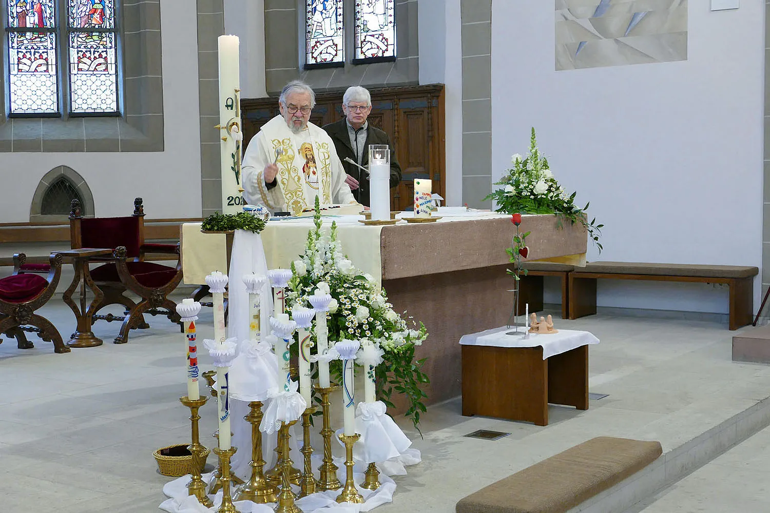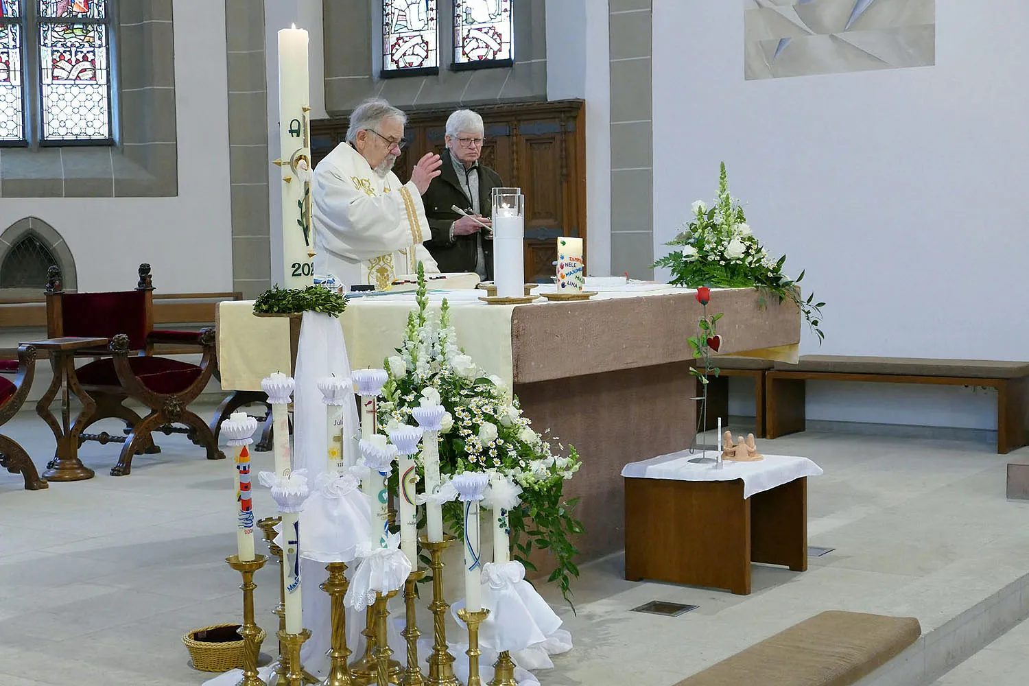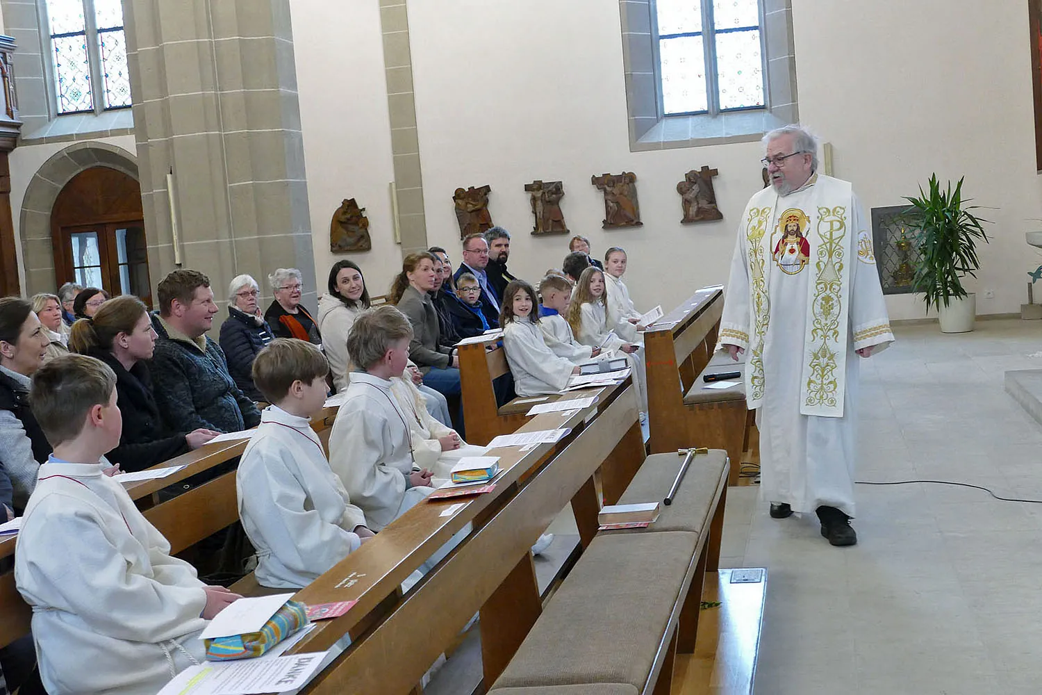 Nach Abschluss der Heiligen Messe segnete Stadtpfarrer Kowal die mitgebrachten Geschenke und religiösen Utensilien der Kommunionkinder. Frau Mihm verteilte anschließend noch die Bronzekreuze, die die Kirchengemeinde St. Heimerad den Kommunionkindern in diesem Jahr schenkte.