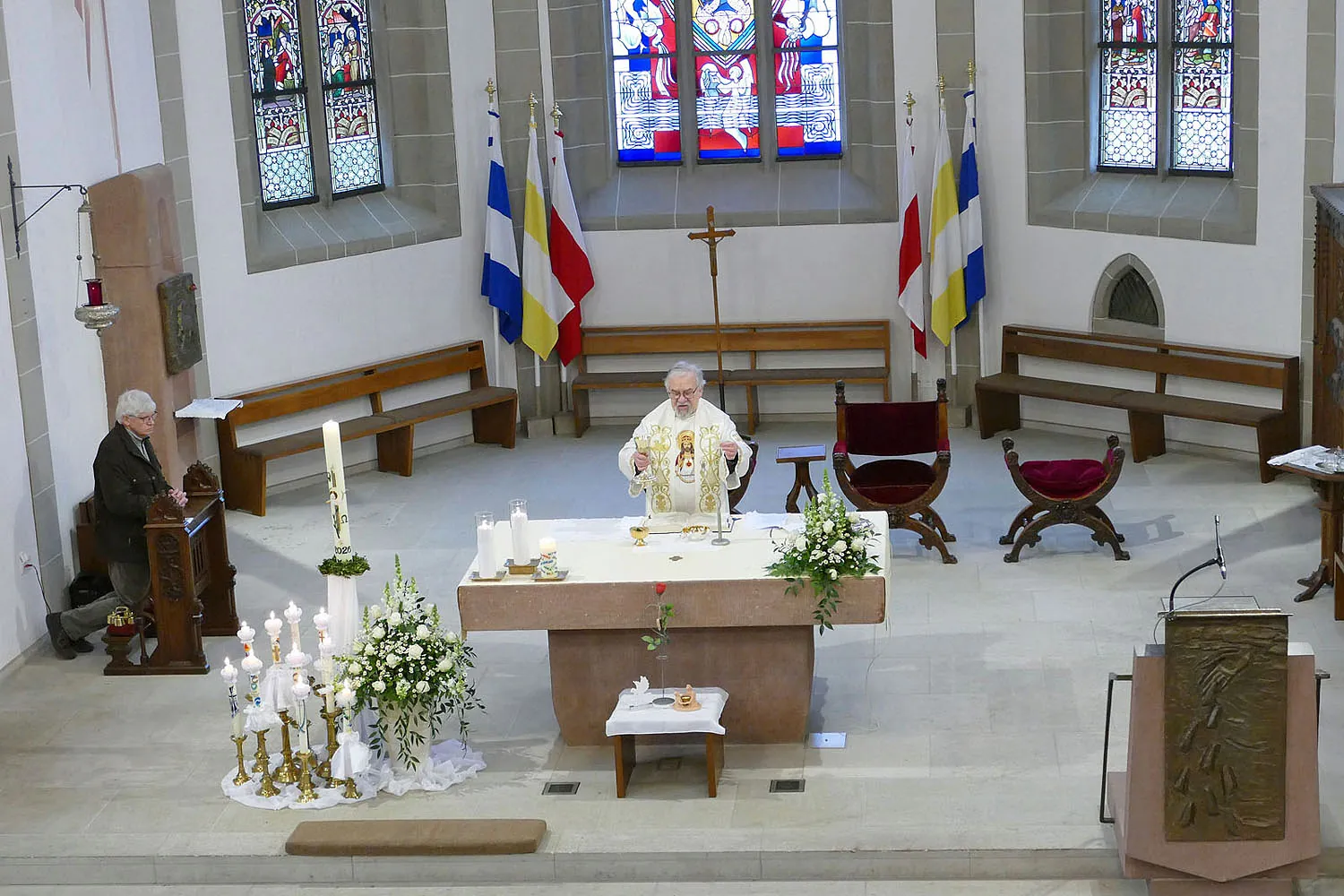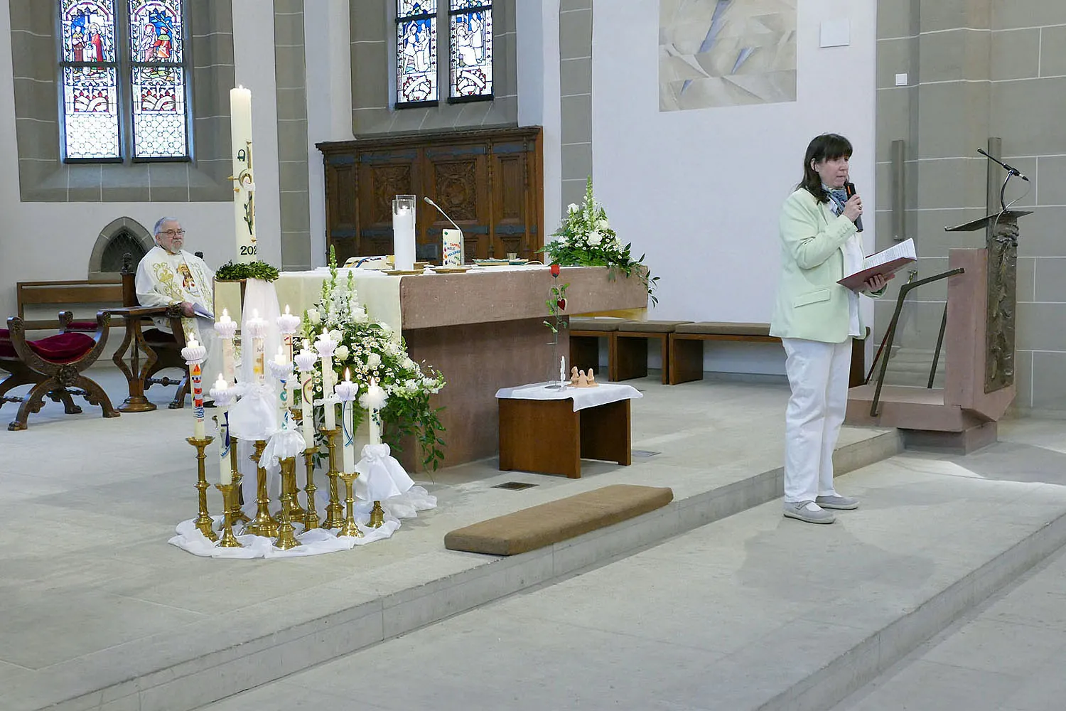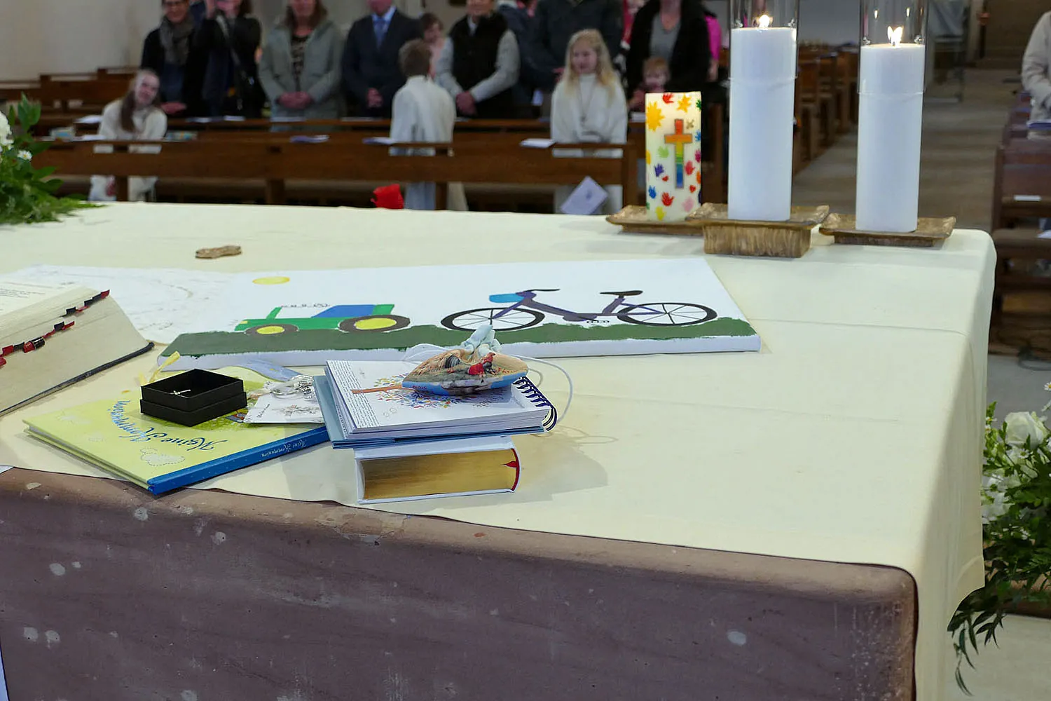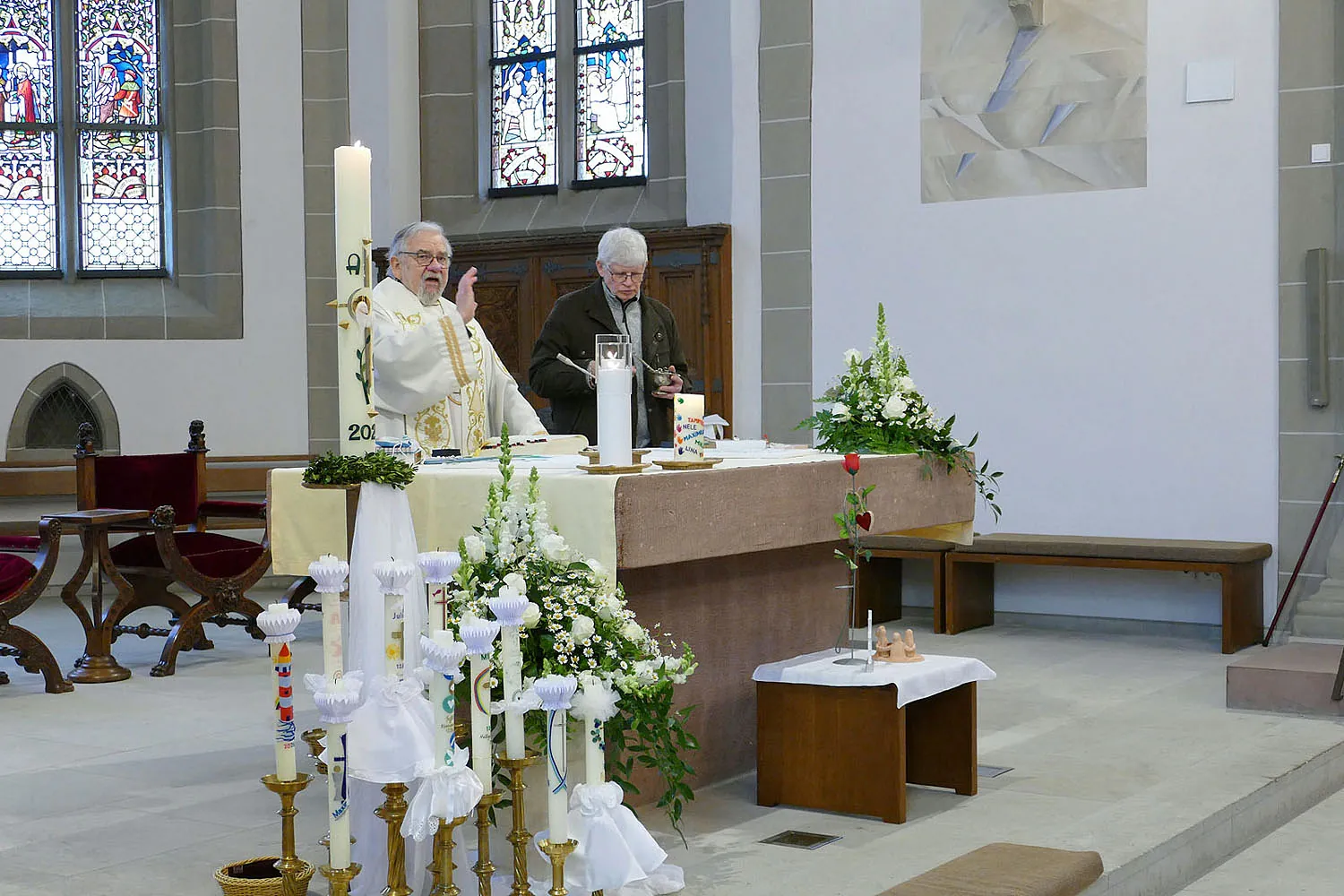 Nach Abschluss der Heiligen Messe segnete Stadtpfarrer Kowal die mitgebrachten Geschenke und religiösen Utensilien der Kommunionkinder. Frau Mihm verteilte anschließend noch die Bronzekreuze, die die Kirchengemeinde St. Heimerad den Kommunionkindern in diesem Jahr schenkte.