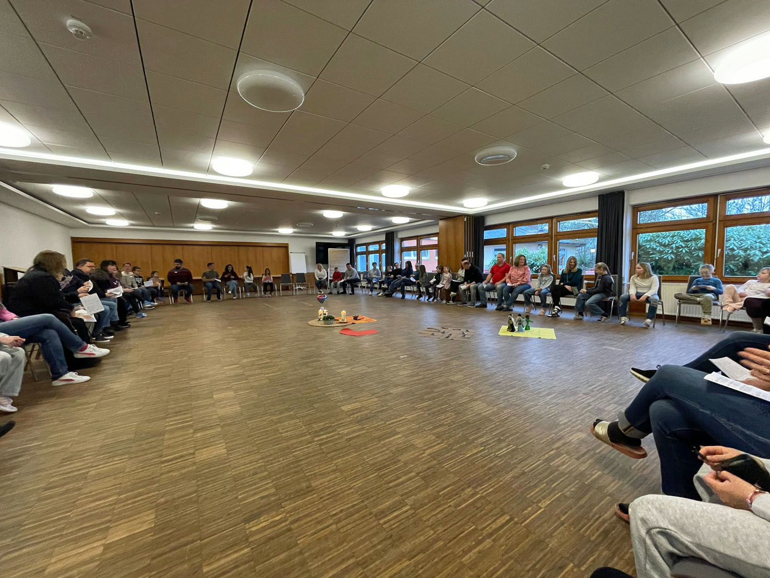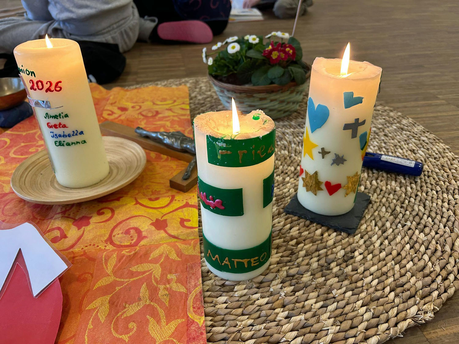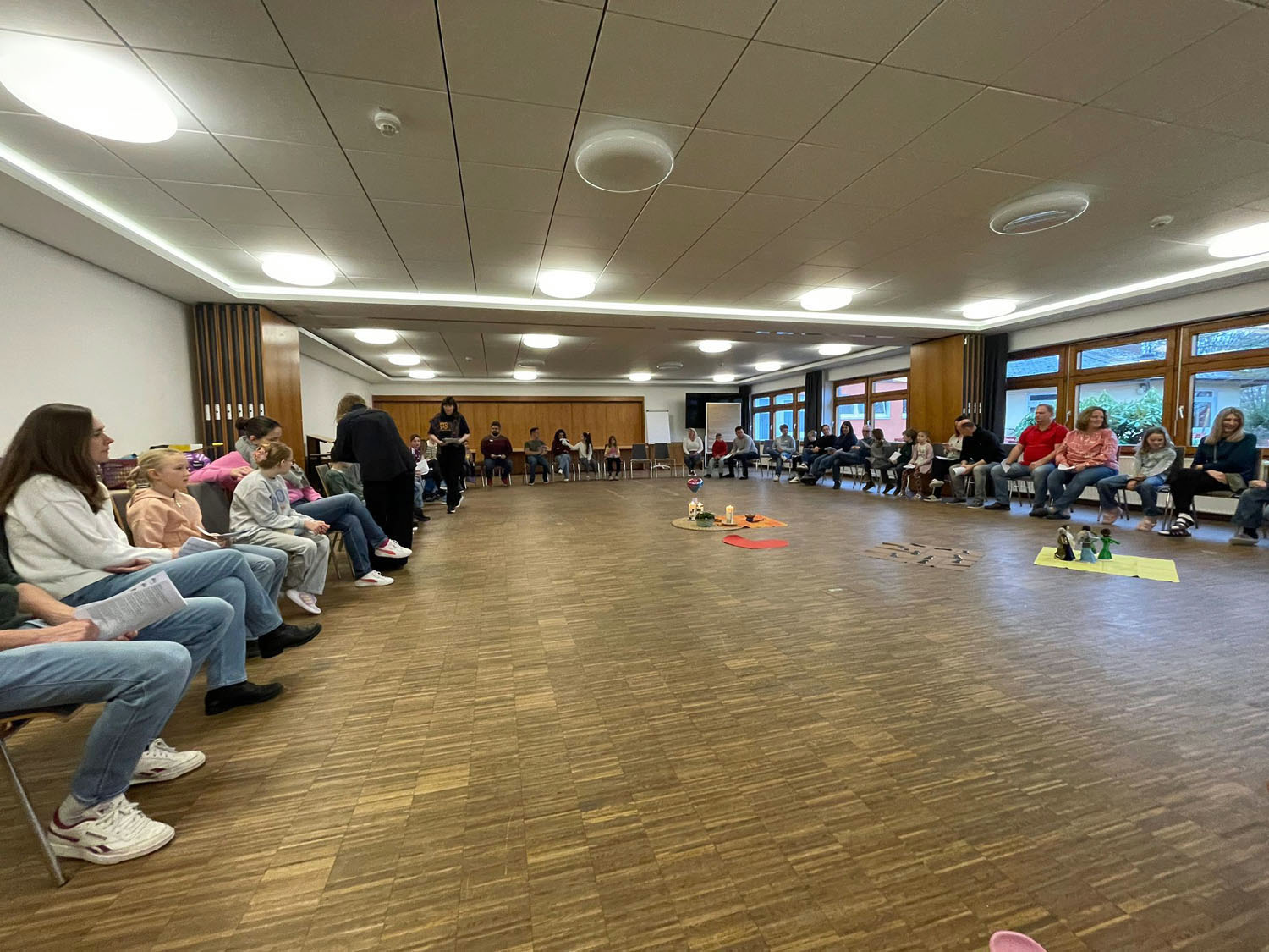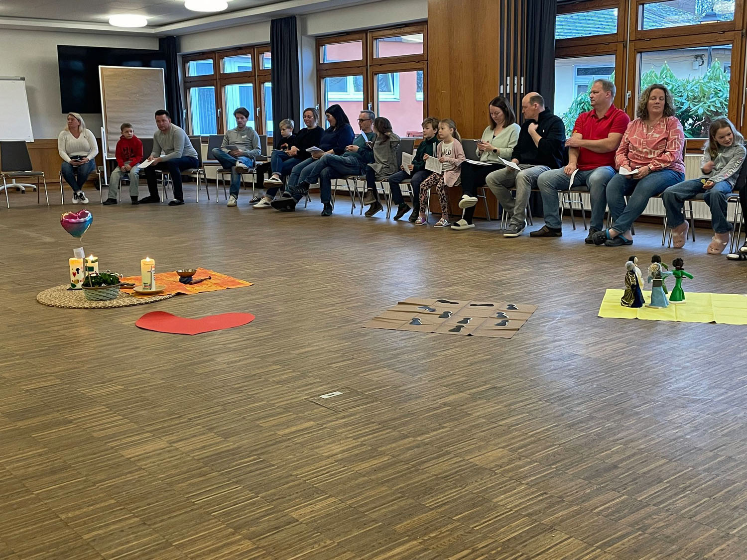 Nach der Vorstellung der Familien gingen sie in die einzelnen Gruppen. Es gab auch ein Abendgebet. Die Erstkommunionkinder arbeiteten dieses Wochenende zum Aufbau der Messfeier mit Hilfe von Legungen durch Figuren und Kettmaterial und gestalteten Kreuze und die Osterkerze. Die Eltern bekamen Impulse von dem Diakon Alexander von Rüden und von Gemeindereferentin Gisela Mihm.