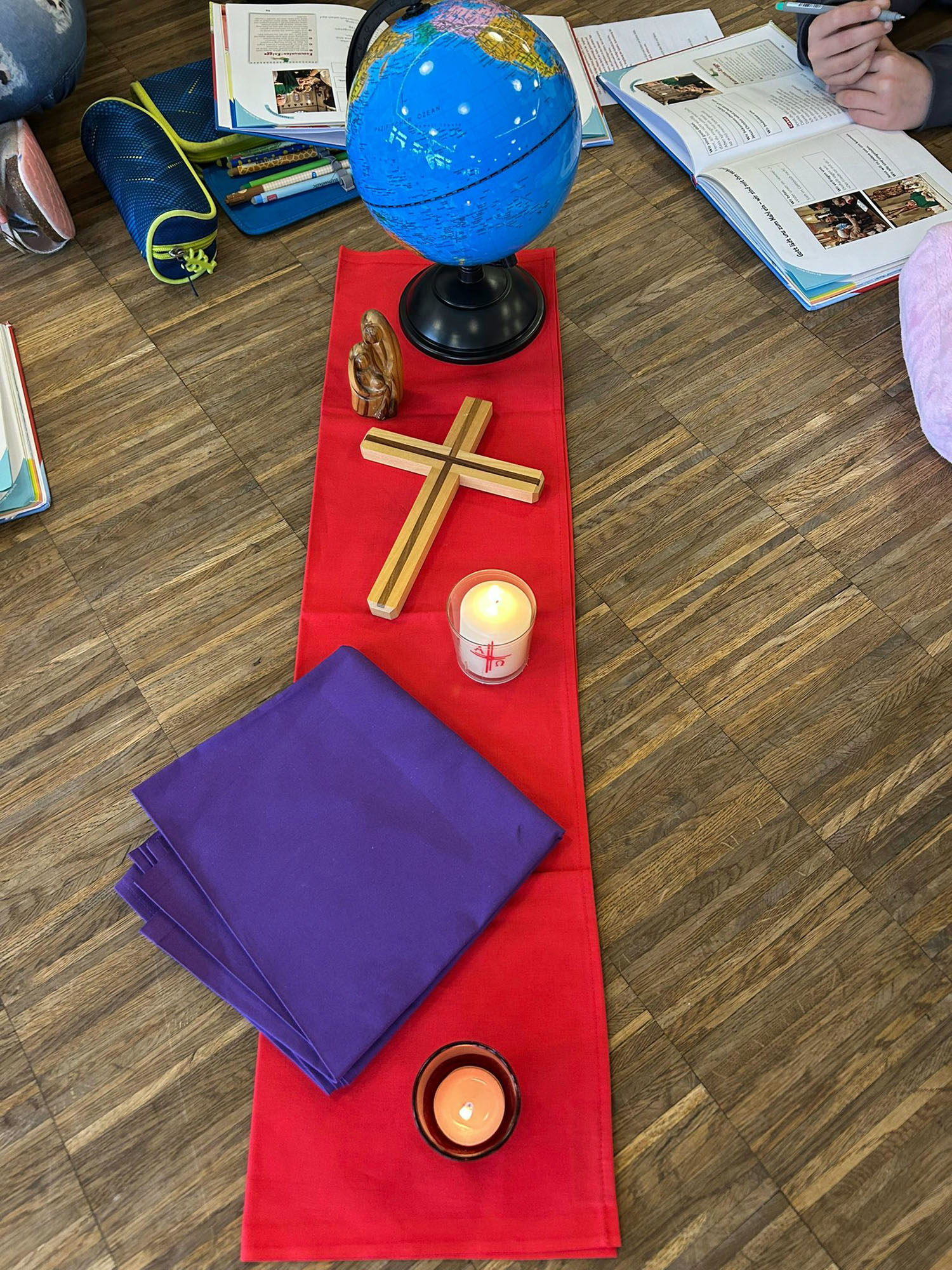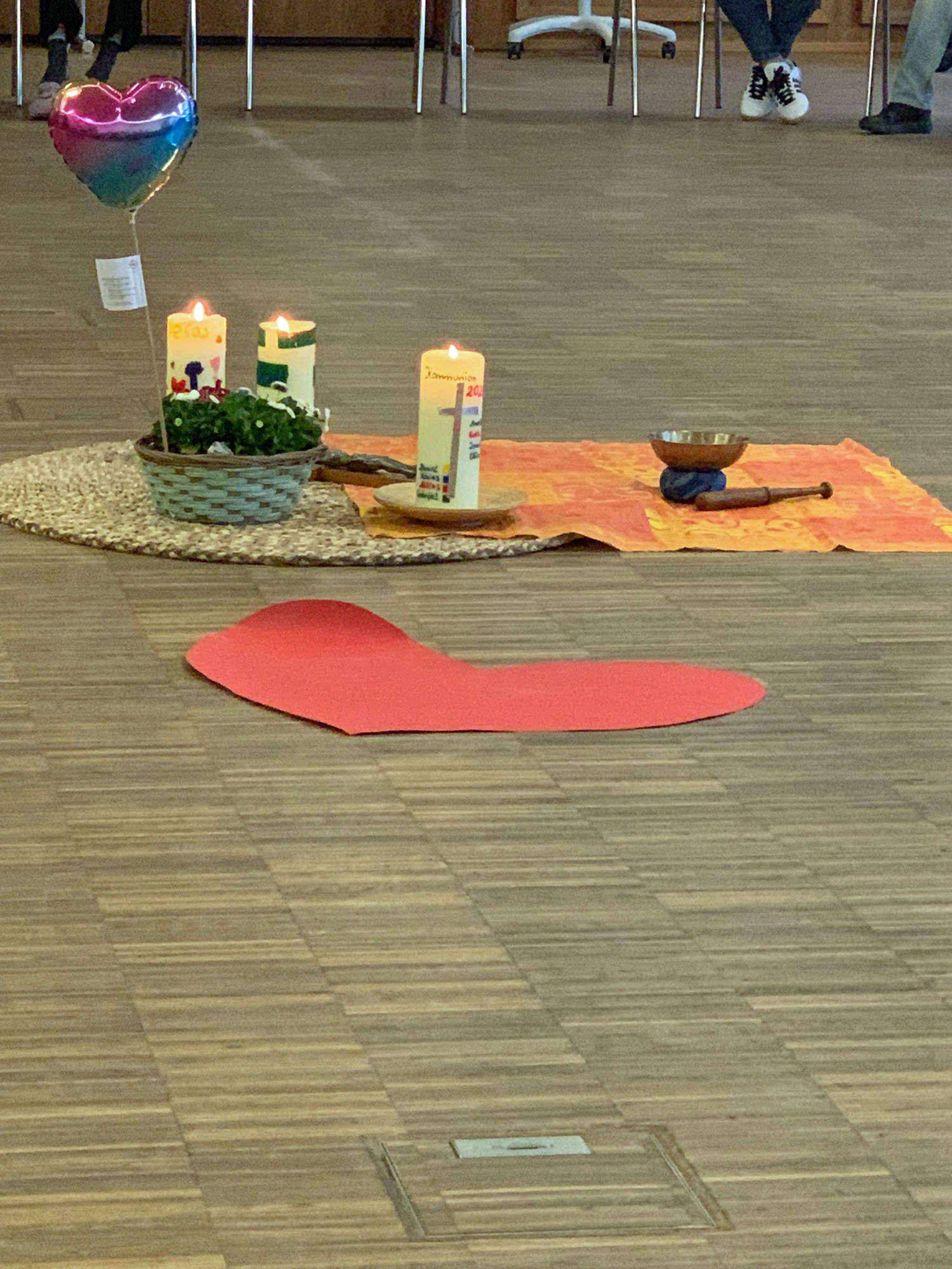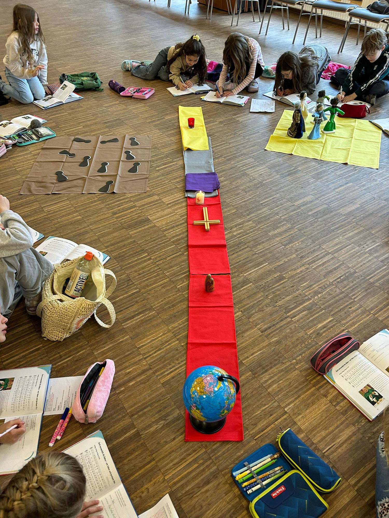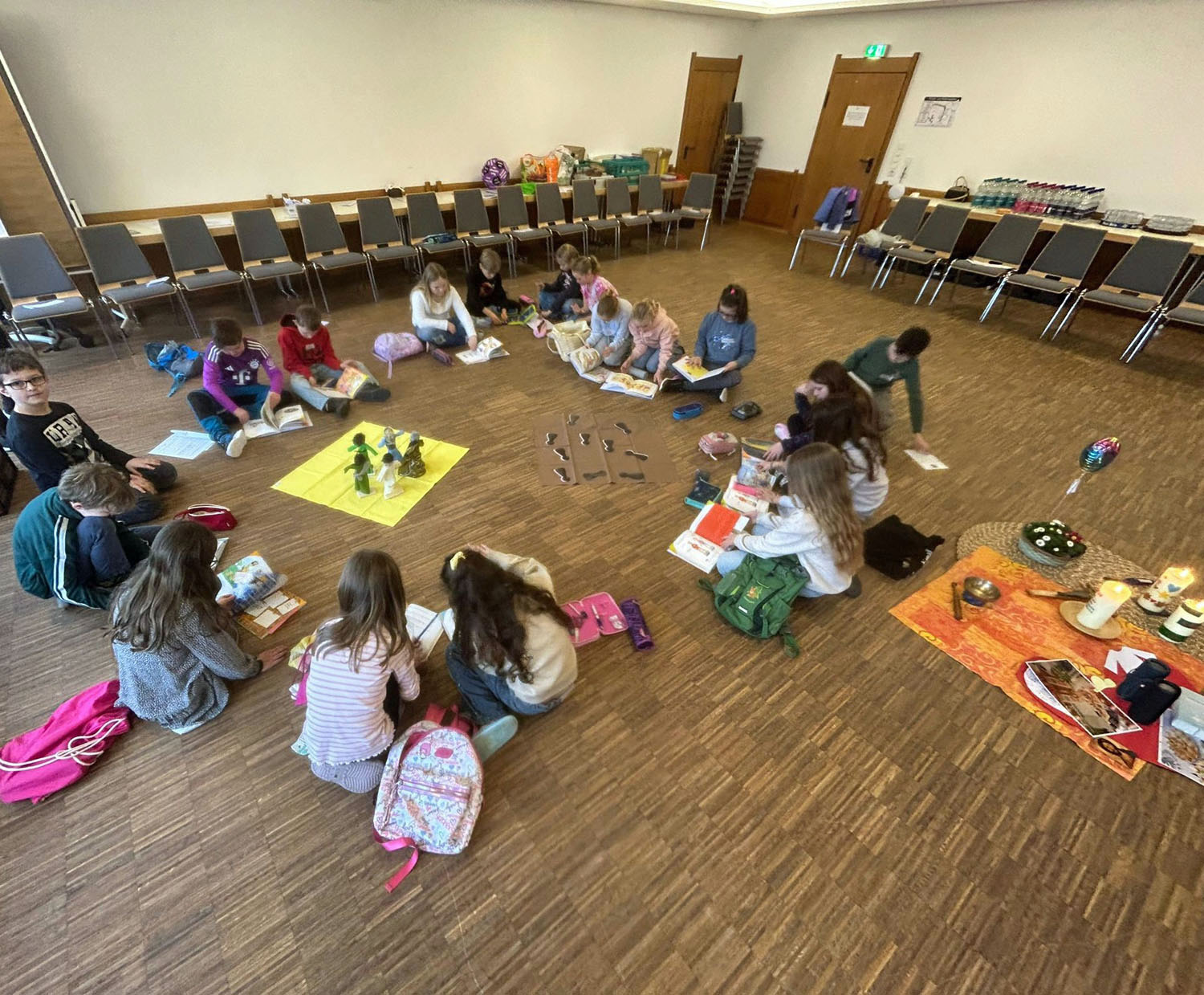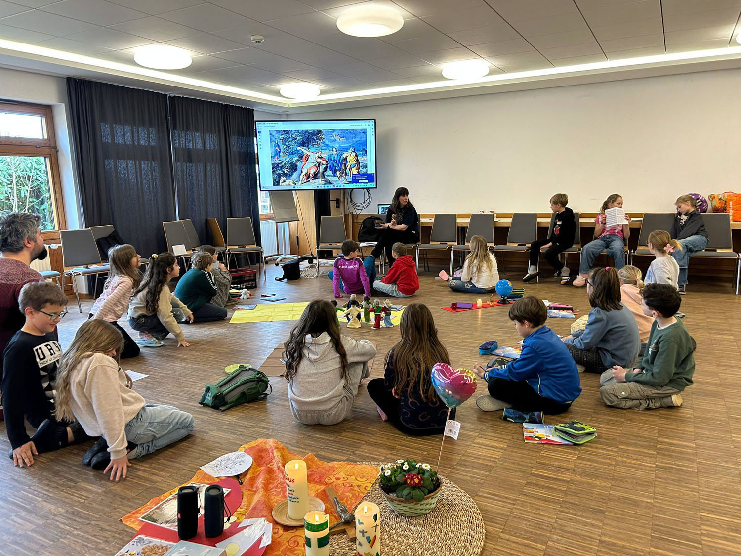 Nach der Vorstellung der Familien gingen sie in die einzelnen Gruppen. Es gab auch ein Abendgebet. Die Erstkommunionkinder arbeiteten dieses Wochenende zum Aufbau der Messfeier mit Hilfe von Legungen durch Figuren und Kettmaterial und gestalteten Kreuze und die Osterkerze. Die Eltern bekamen Impulse von dem Diakon Alexander von Rüden und von Gemeindereferentin Gisela Mihm.
