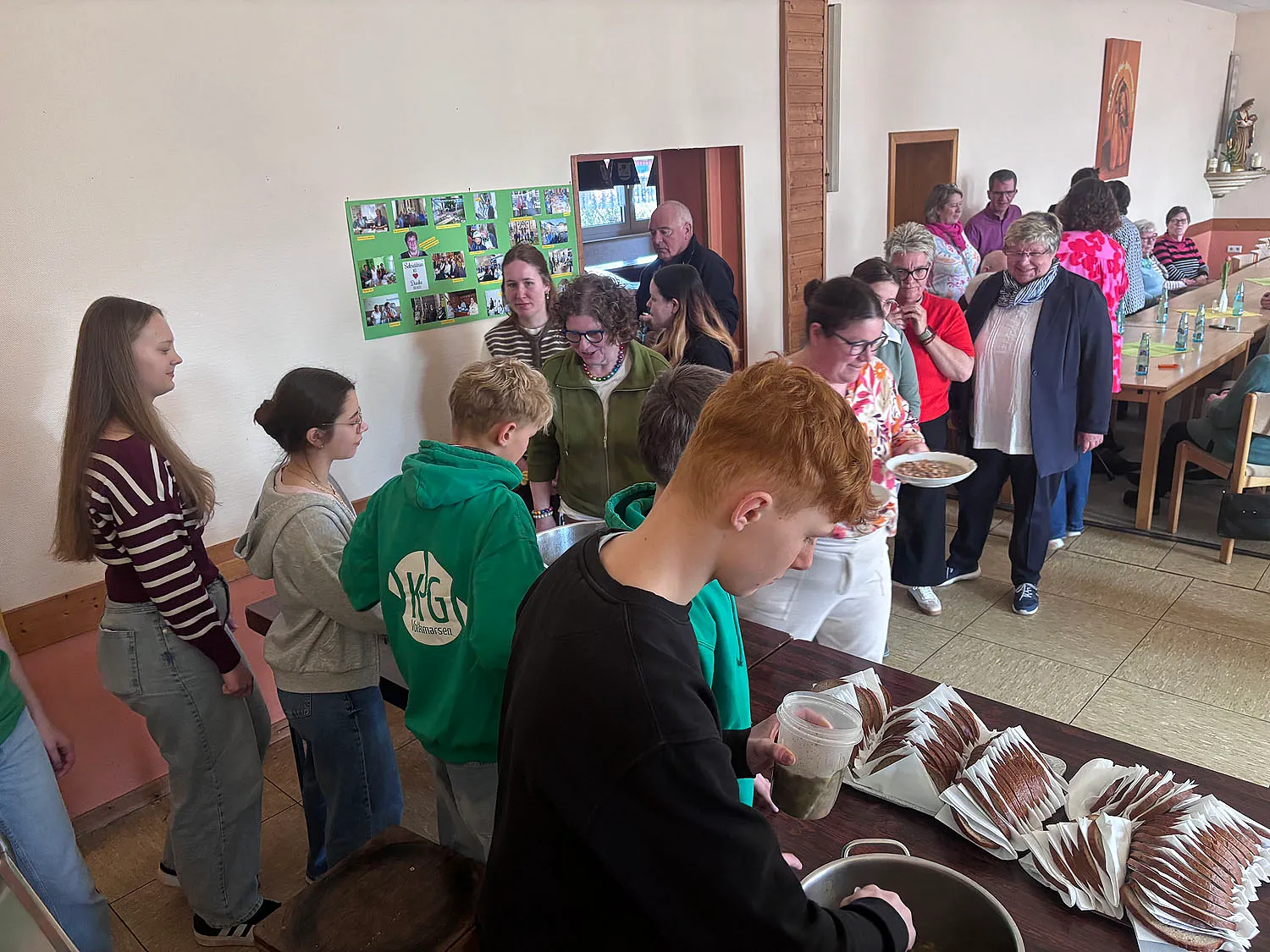 Das Fastenessen begann mit einer kurzen Andacht, gestaltet von Diakon Alexander von Rüden und Gemeindereferentin Frau Gisela Mihm. Die anwesenden Gläubigen der Kirchengemeinde konnten dann im Anschluss die leckere Linsensuppe genießen. Hier unterstütze die KJG Volkmarsen mit zahlreichen Händen.