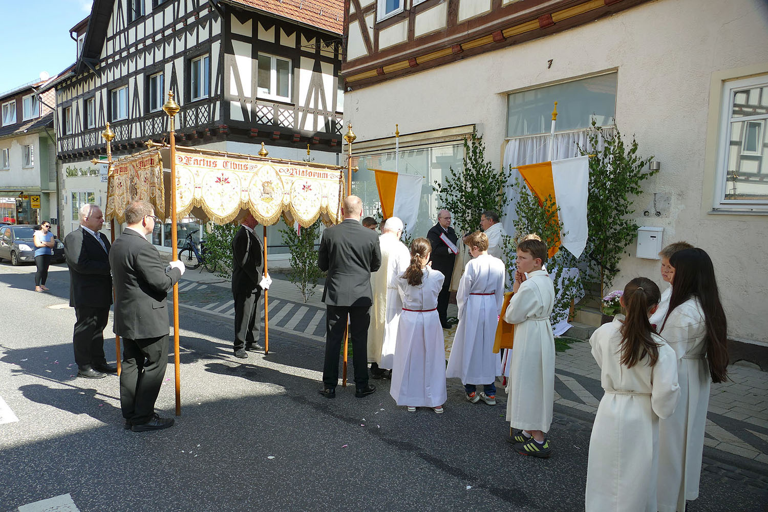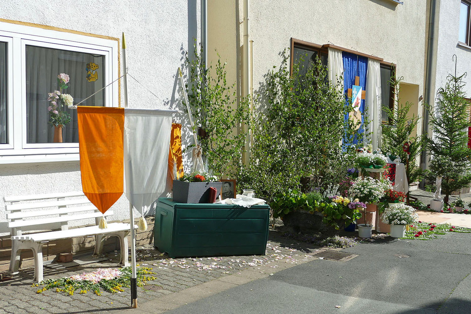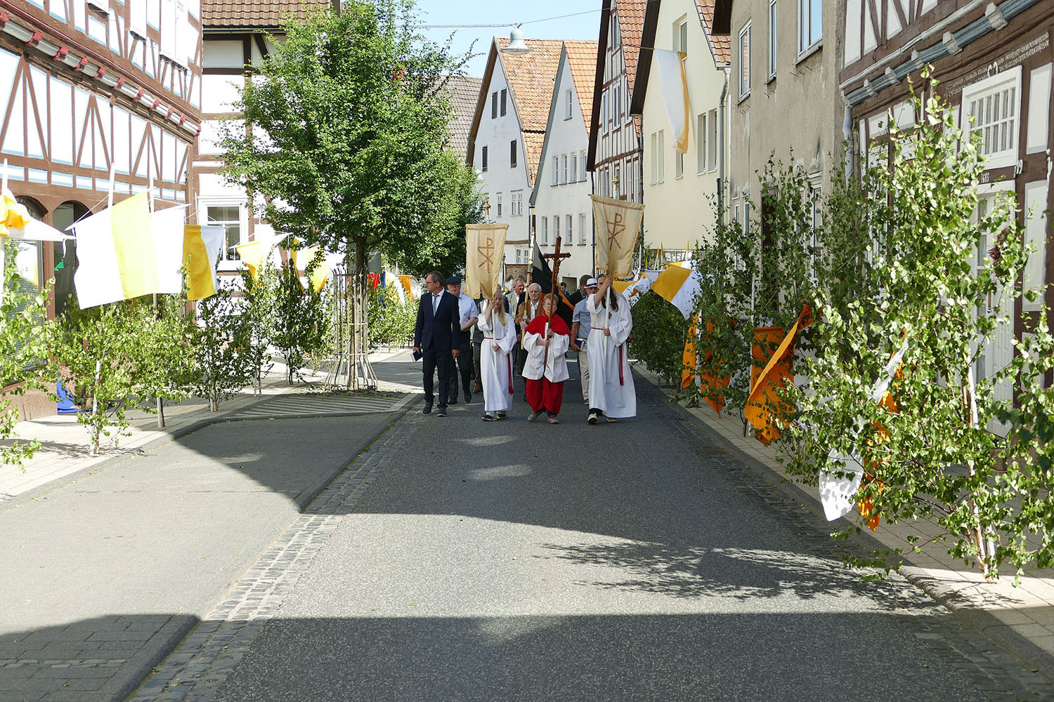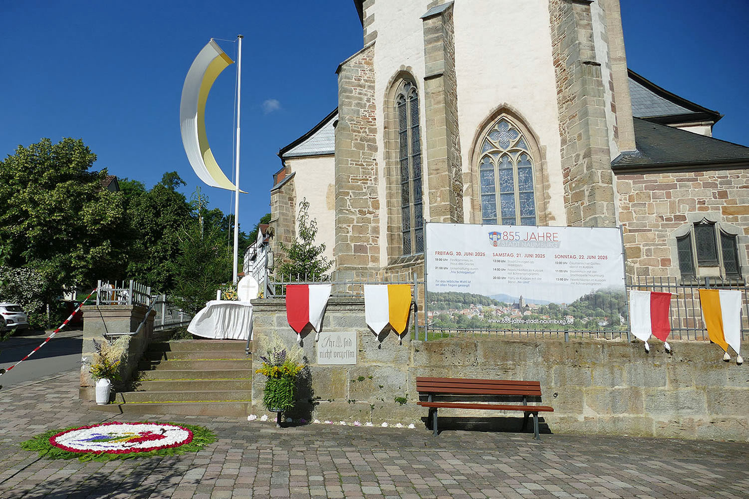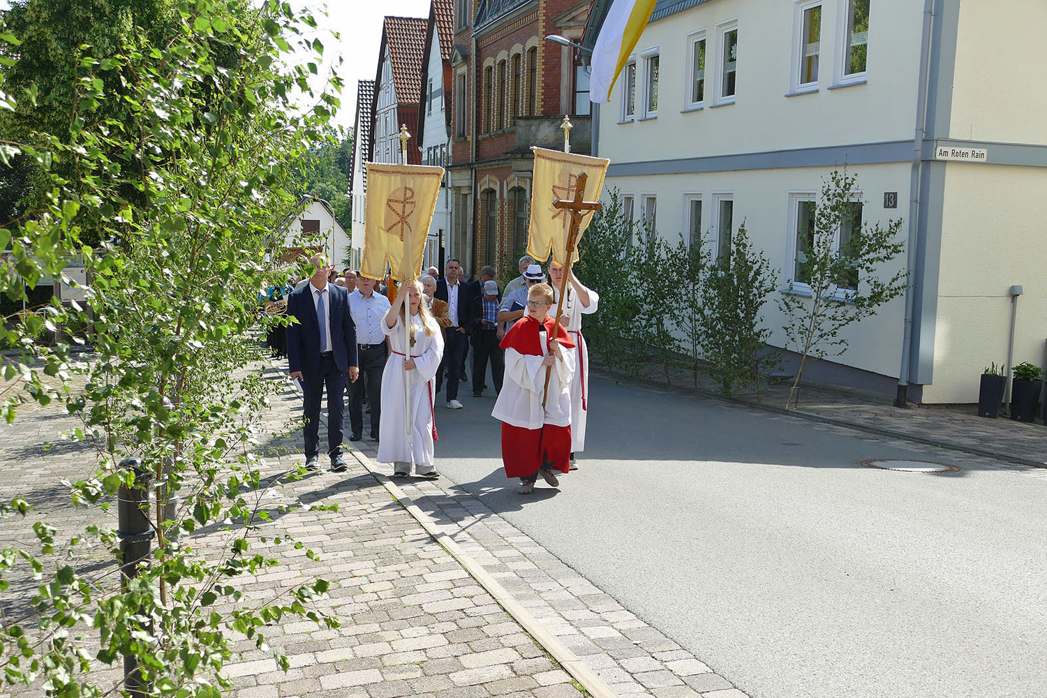 Bei der anschließenden Prozession durch die Straßen der Stadt Naumburg, die mit Büschen, Fahnen und zahlreichen aufgestellten Hausaltären geschmückt waren, nahmen zahlreiche Gemeindemitglieder teil.