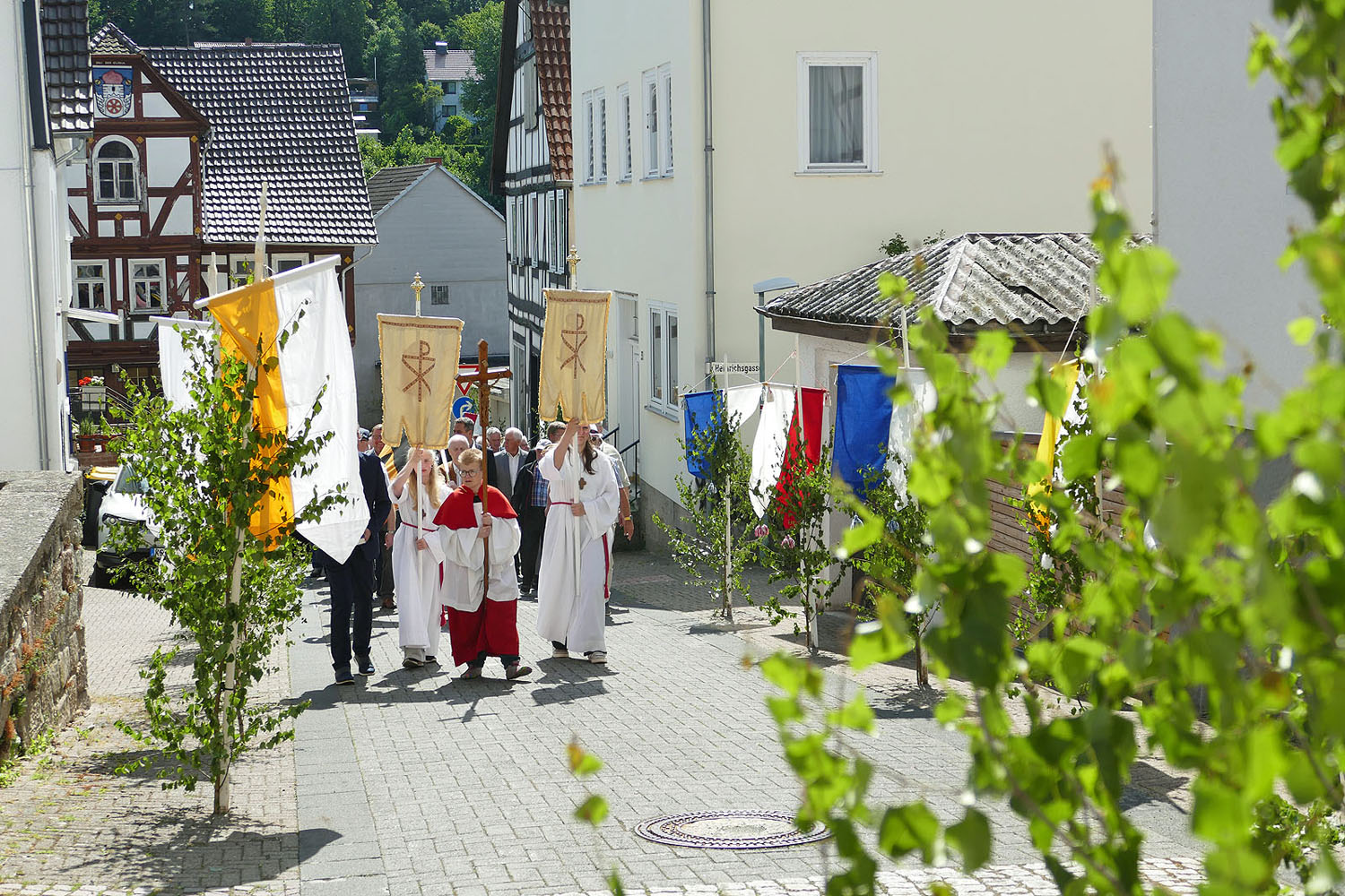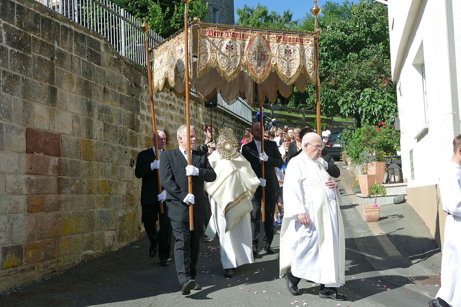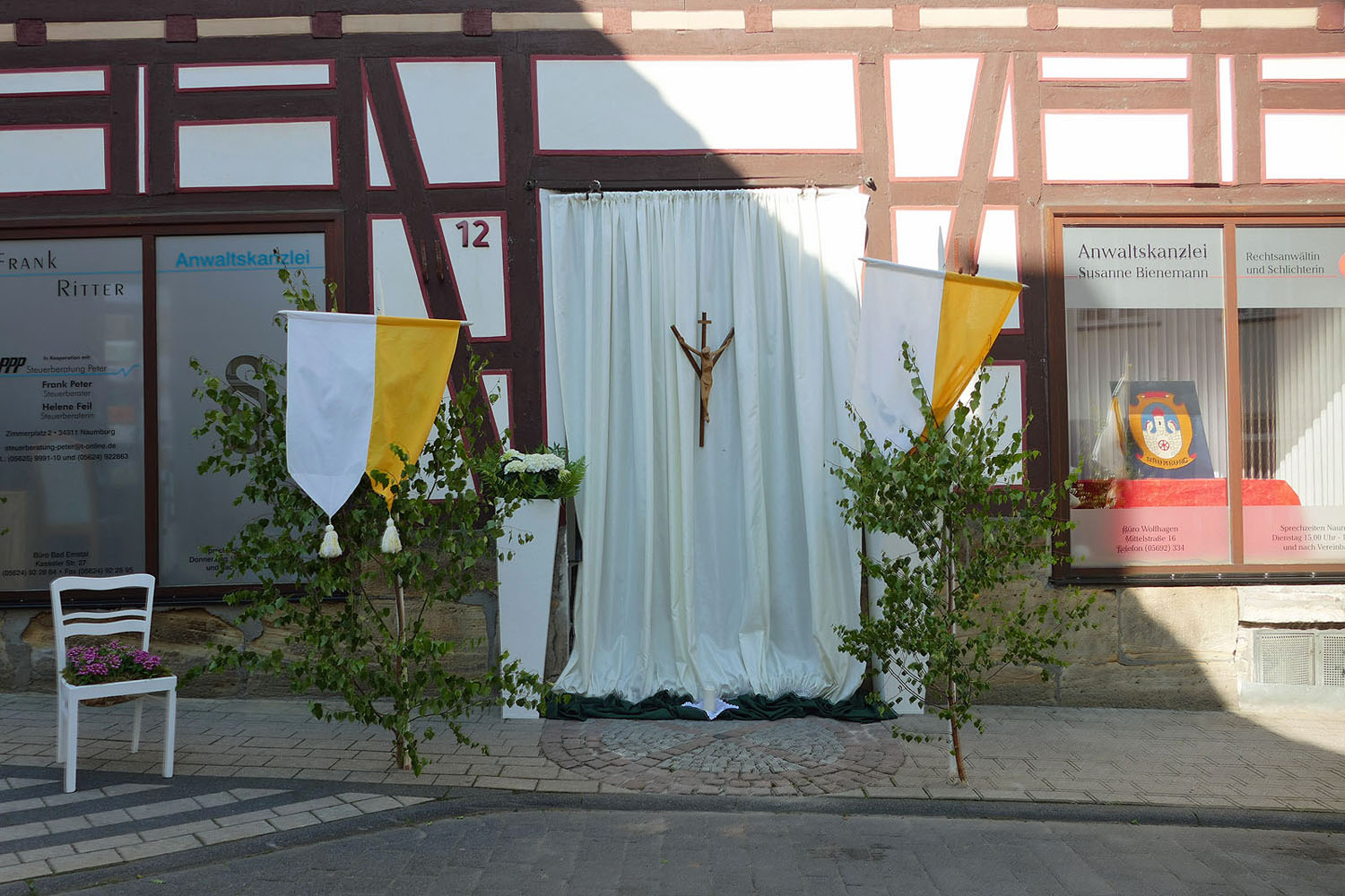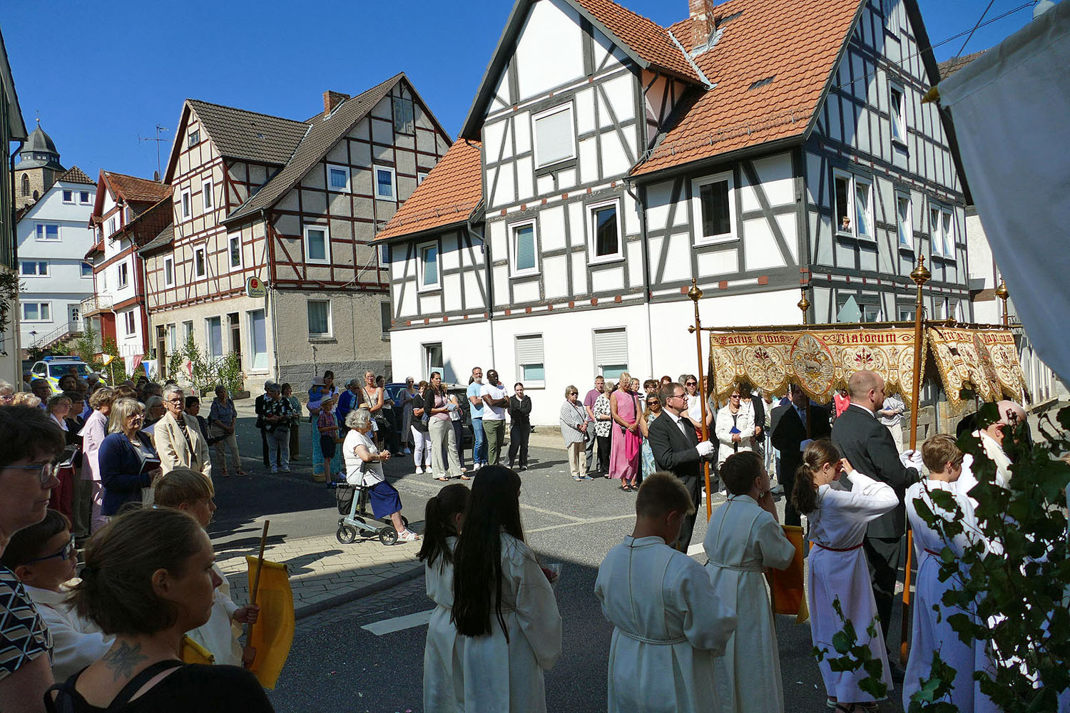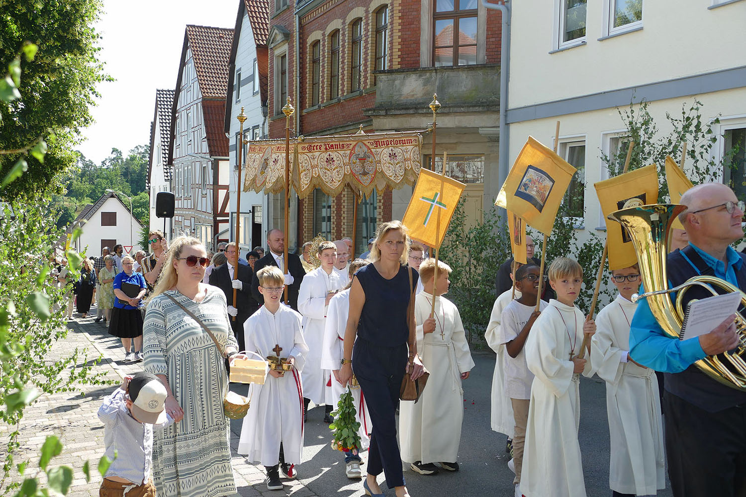 Bei der anschließenden Prozession durch die Straßen der Stadt Naumburg, die mit Büschen, Fahnen und zahlreichen aufgestellten Hausaltären geschmückt waren, nahmen zahlreiche Gemeindemitglieder teil.