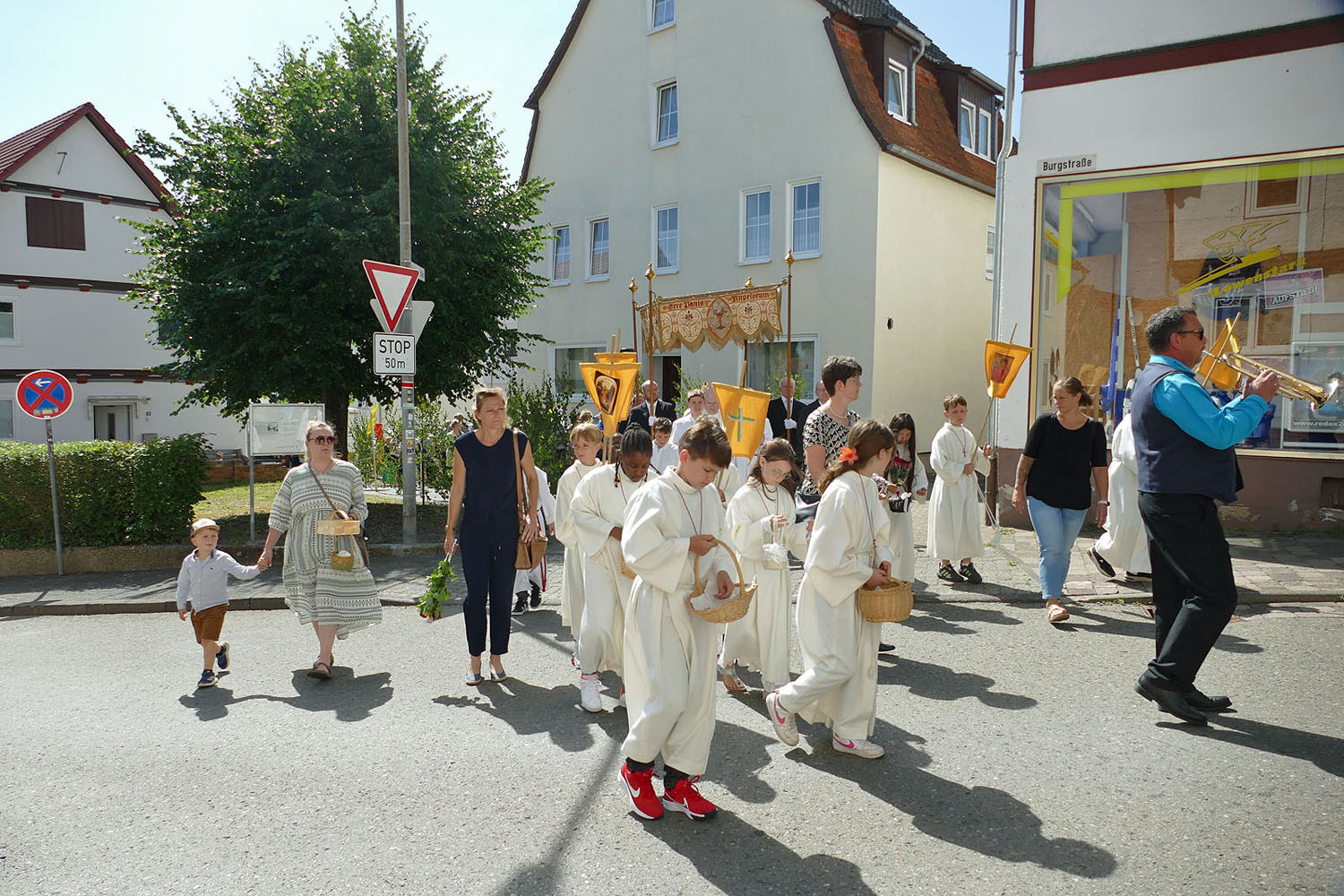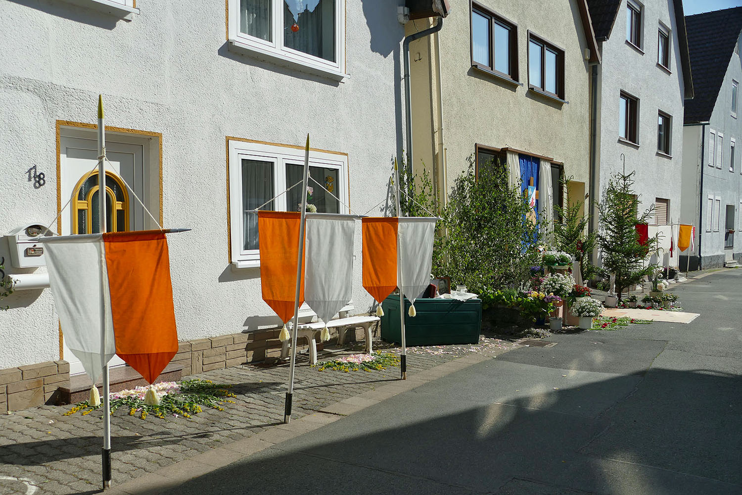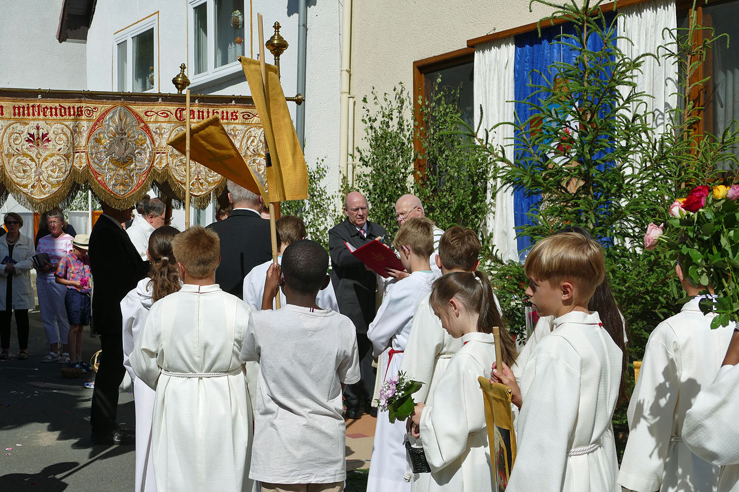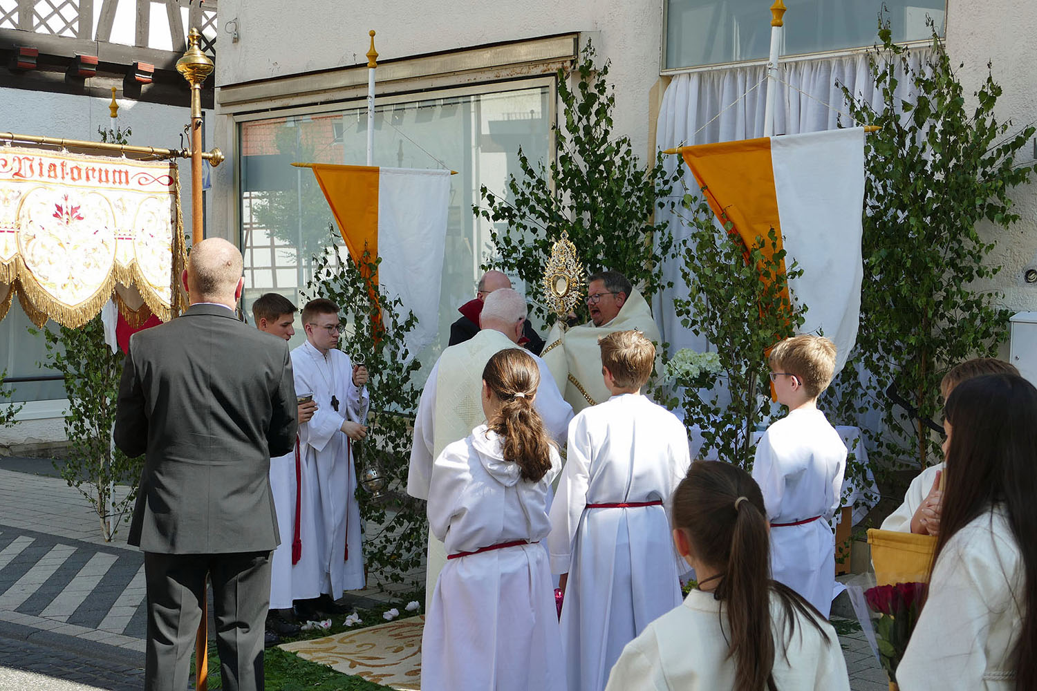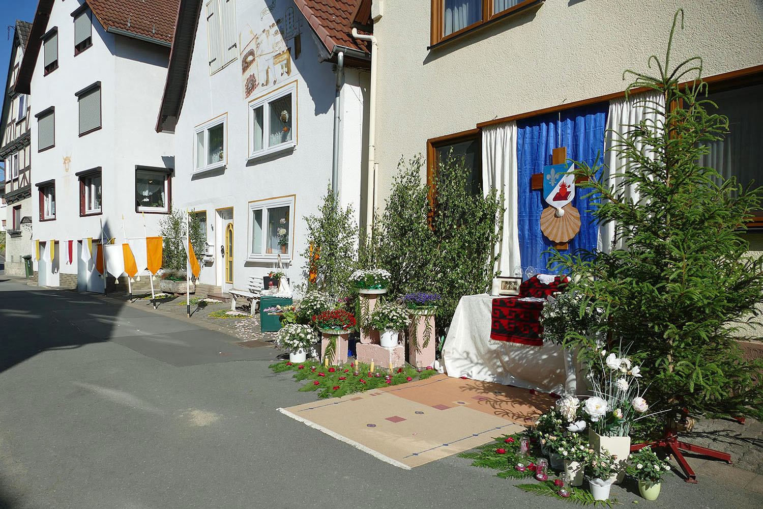 Bei der anschließenden Prozession durch die Straßen der Stadt Naumburg, die mit Büschen, Fahnen und zahlreichen aufgestellten Hausaltären geschmückt waren, nahmen zahlreiche Gemeindemitglieder teil.