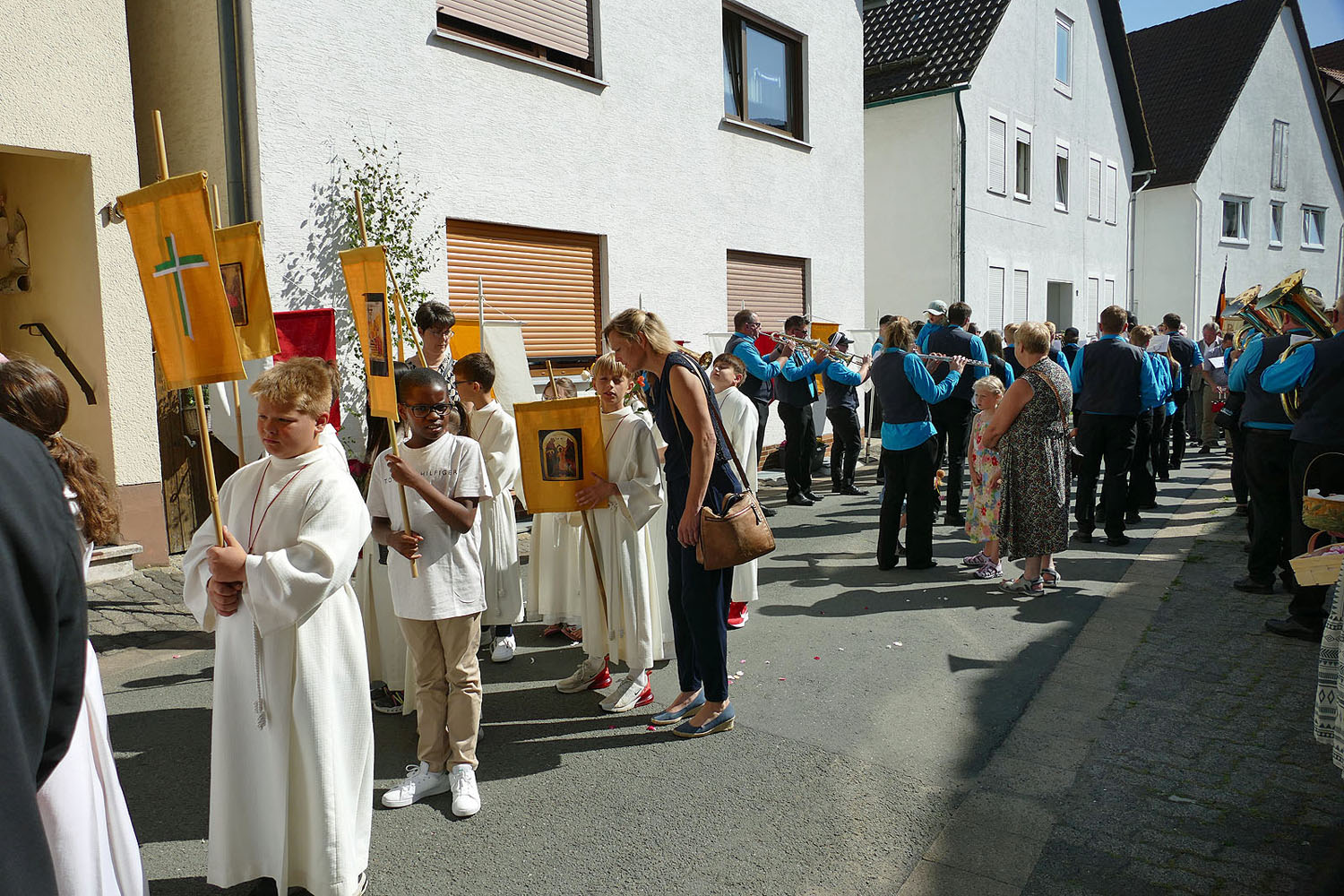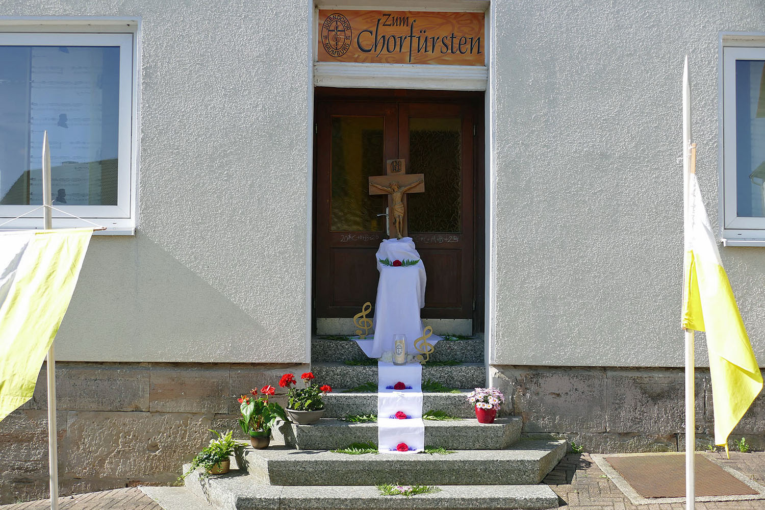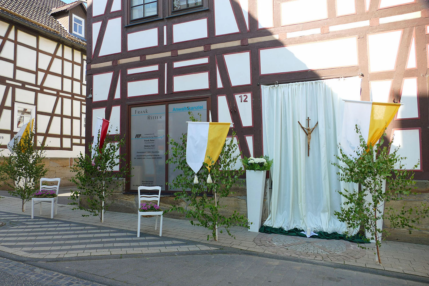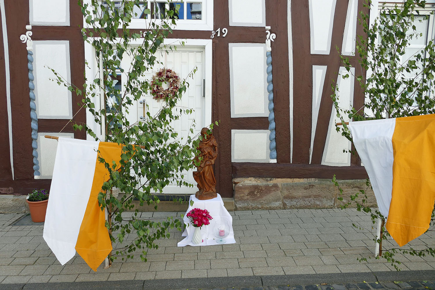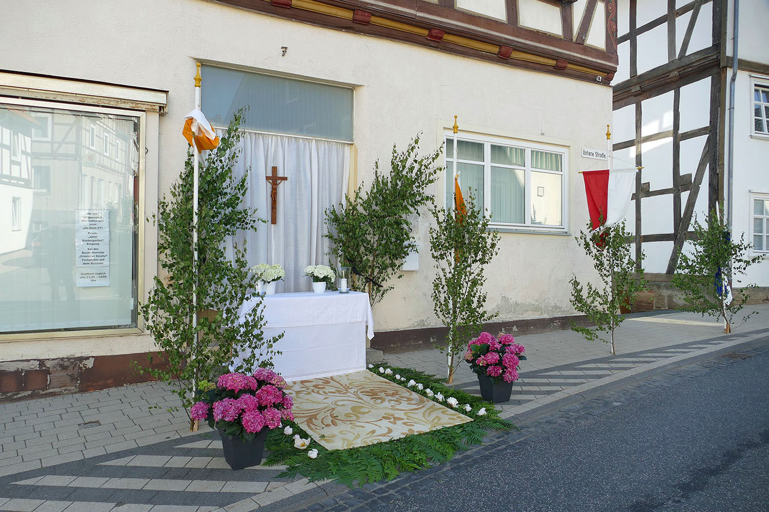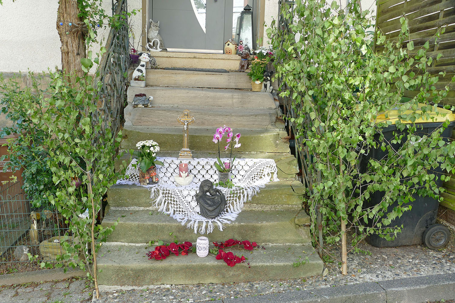 Bei der anschließenden Prozession durch die Straßen der Stadt Naumburg, die mit Büschen, Fahnen und zahlreichen aufgestellten Hausaltären geschmückt waren, nahmen zahlreiche Gemeindemitglieder teil.