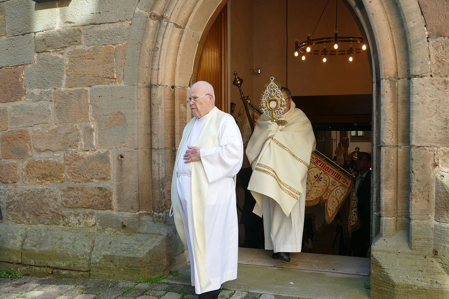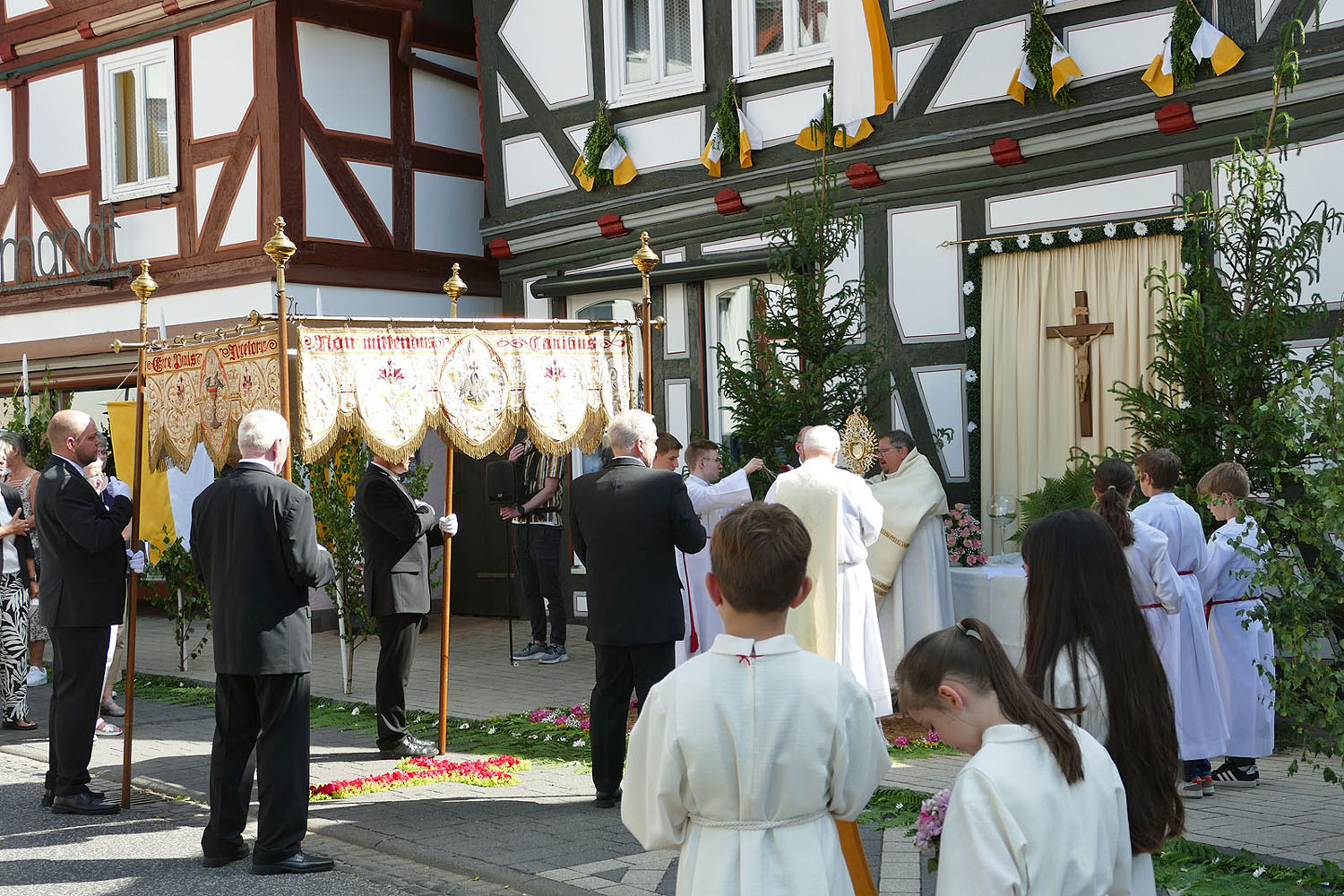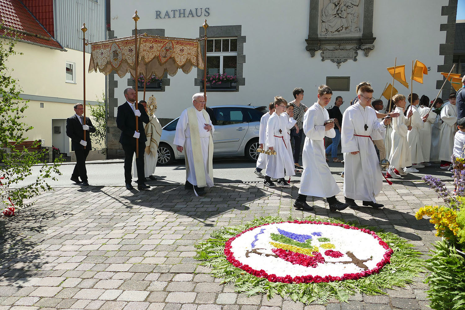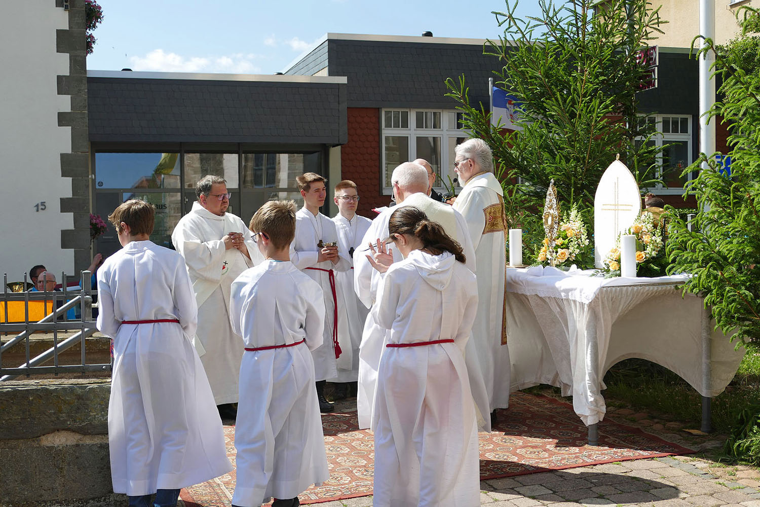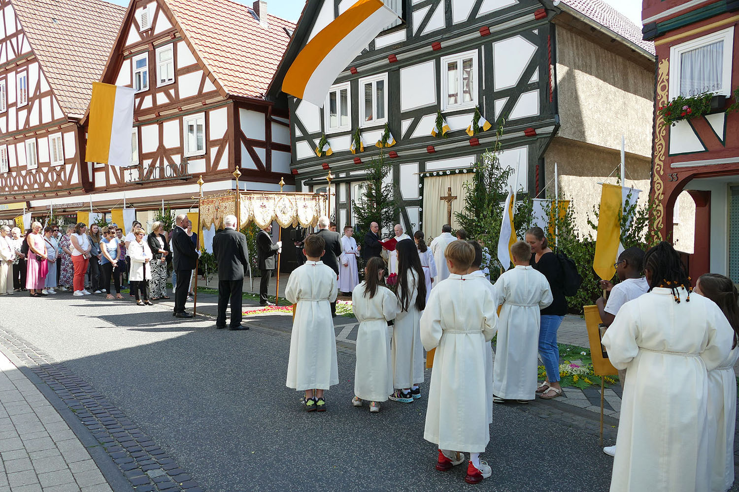Bei der anschließenden Prozession durch die Straßen der Stadt Naumburg, die mit Büschen, Fahnen und zahlreichen aufgestellten Hausaltären geschmückt waren, nahmen zahlreiche Gemeindemitglieder teil.