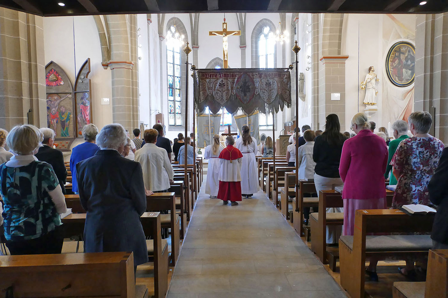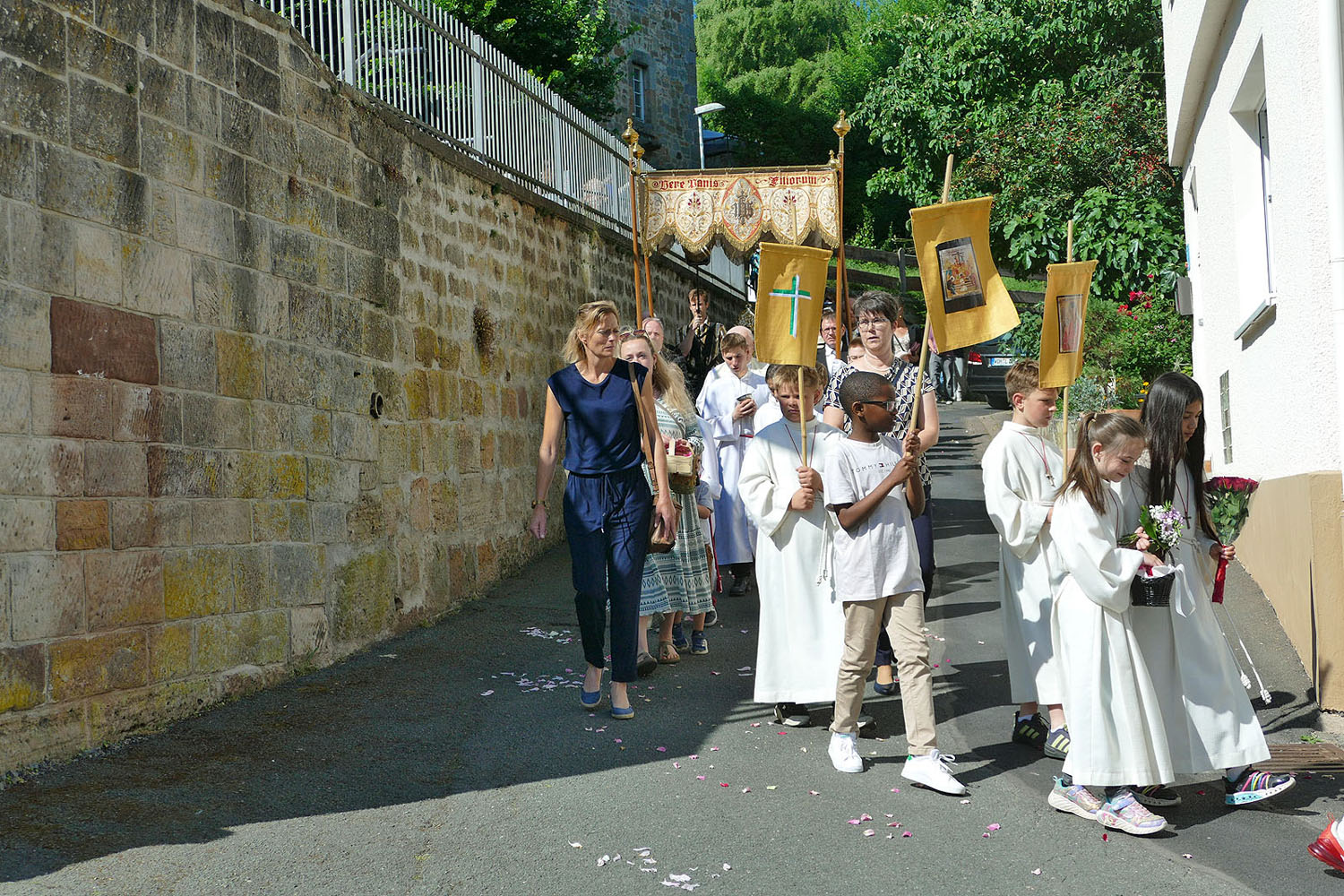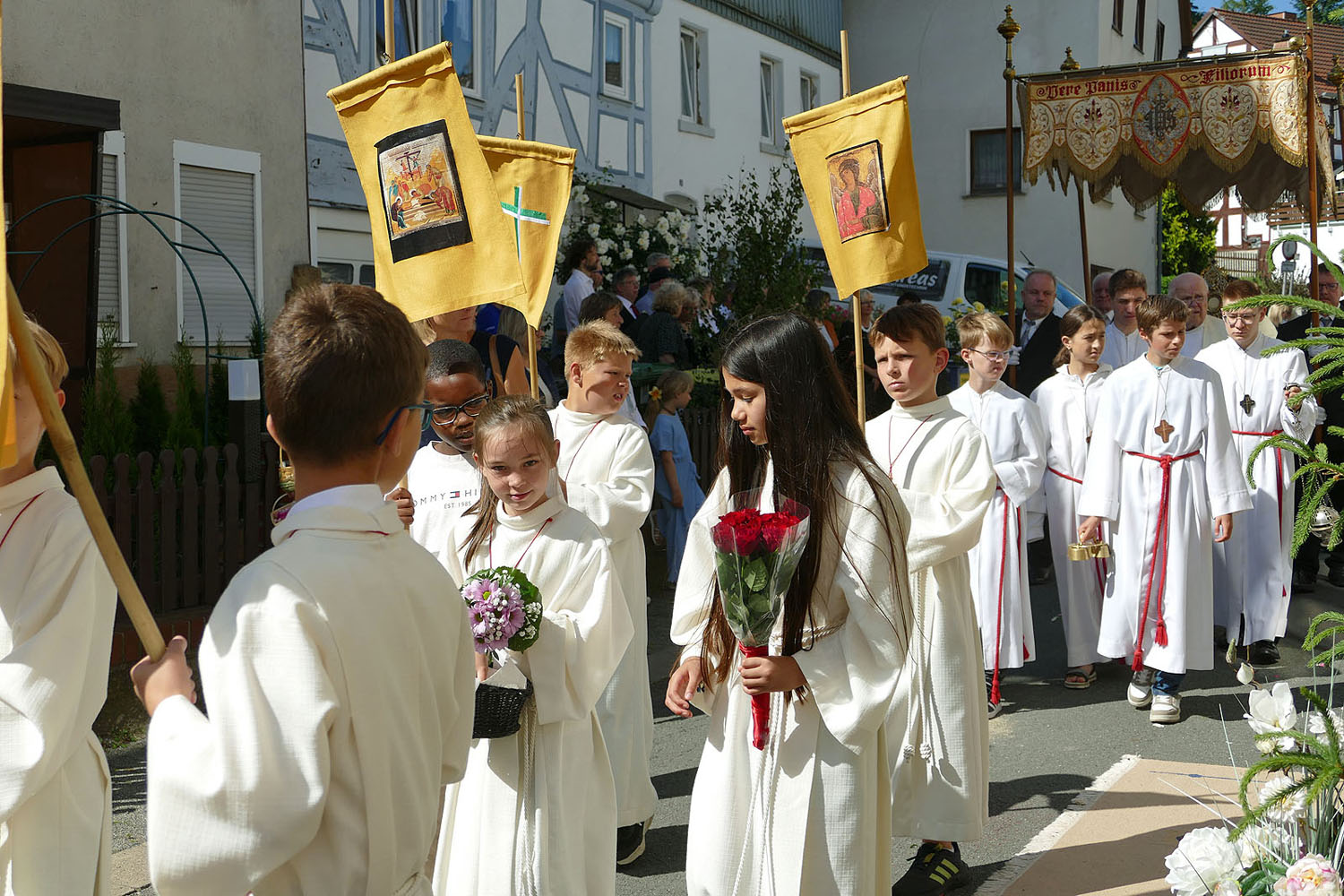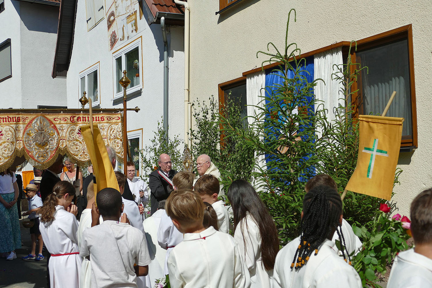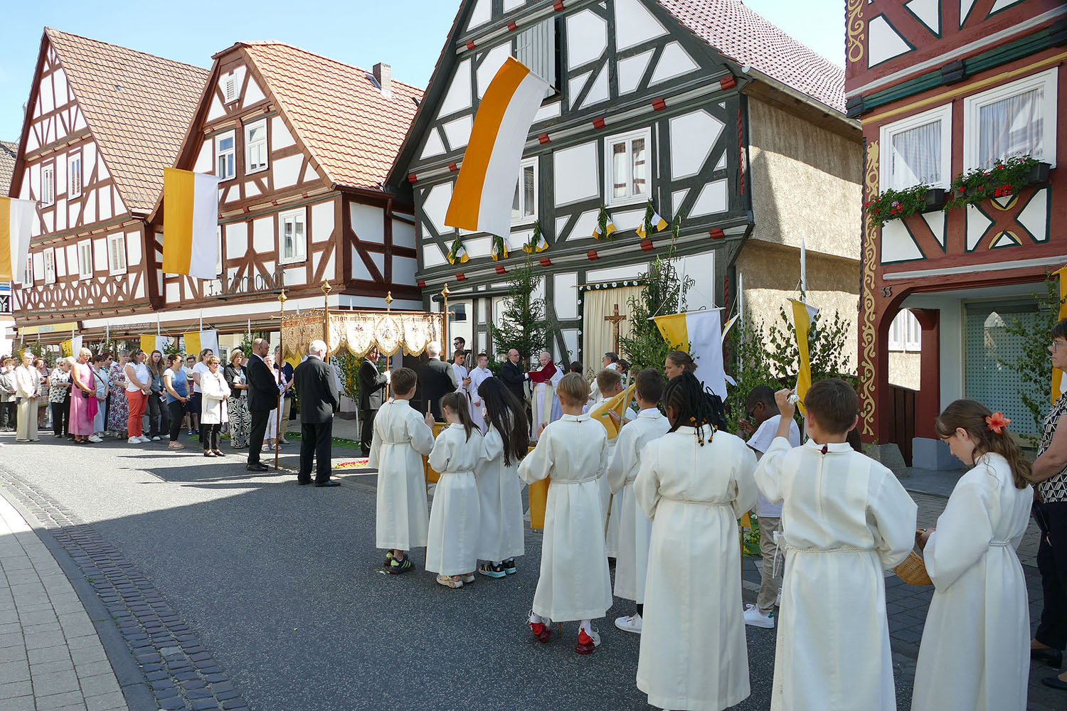 Bei der anschließenden Prozession durch die Straßen der Stadt Naumburg, die mit Büschen, Fahnen und zahlreichen aufgestellten Hausaltären geschmückt waren, nahmen zahlreiche Gemeindemitglieder teil.