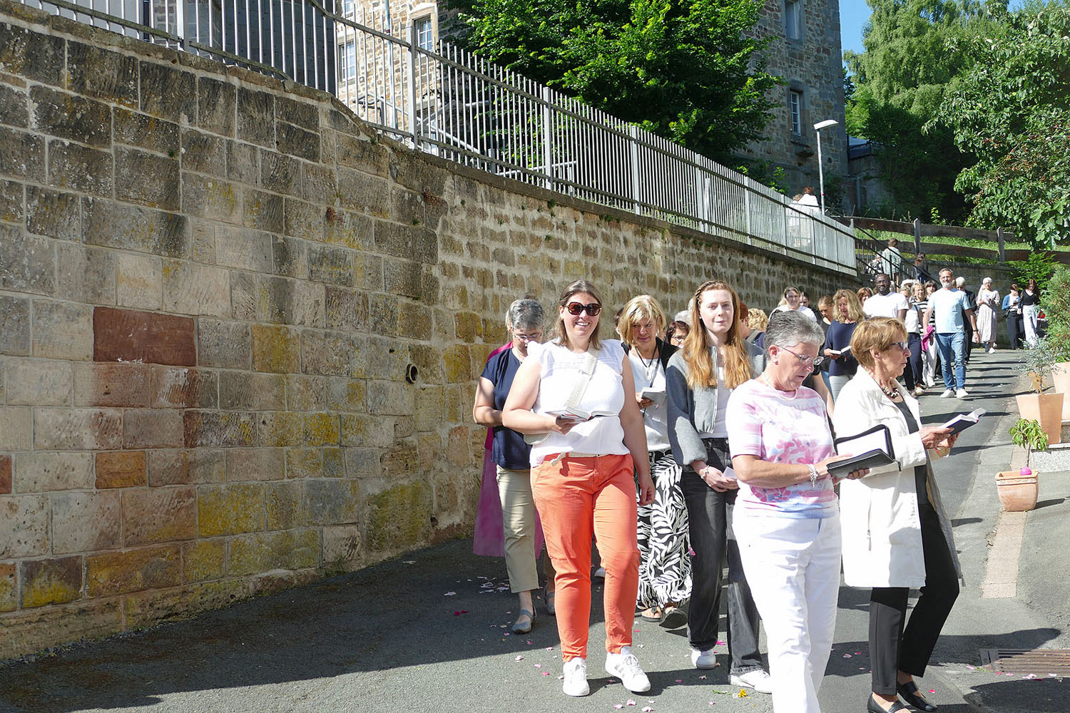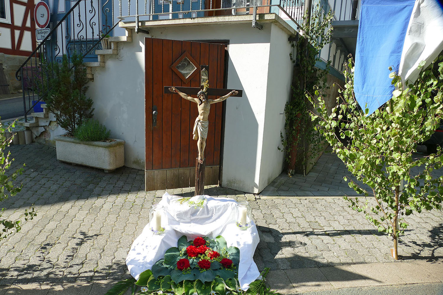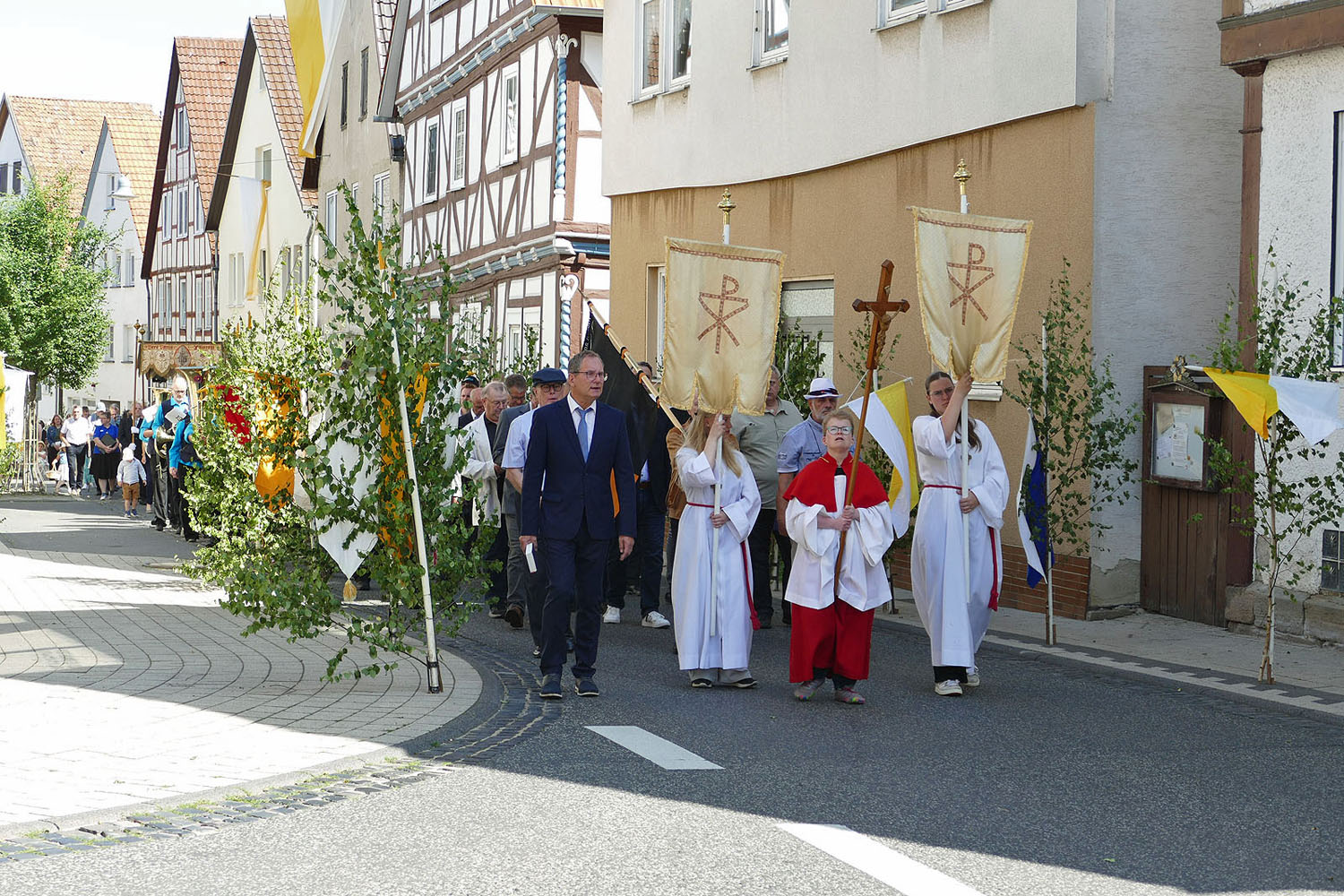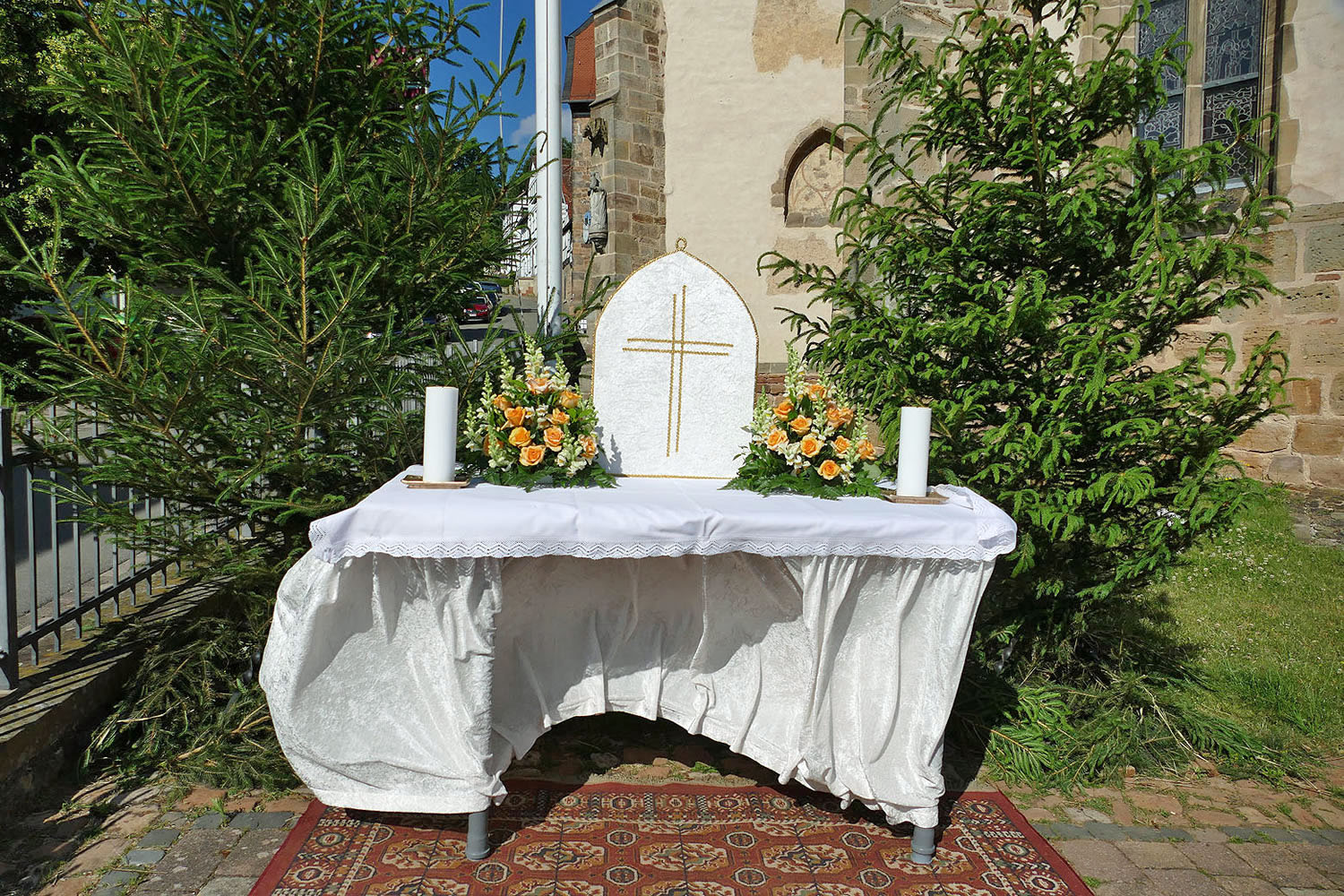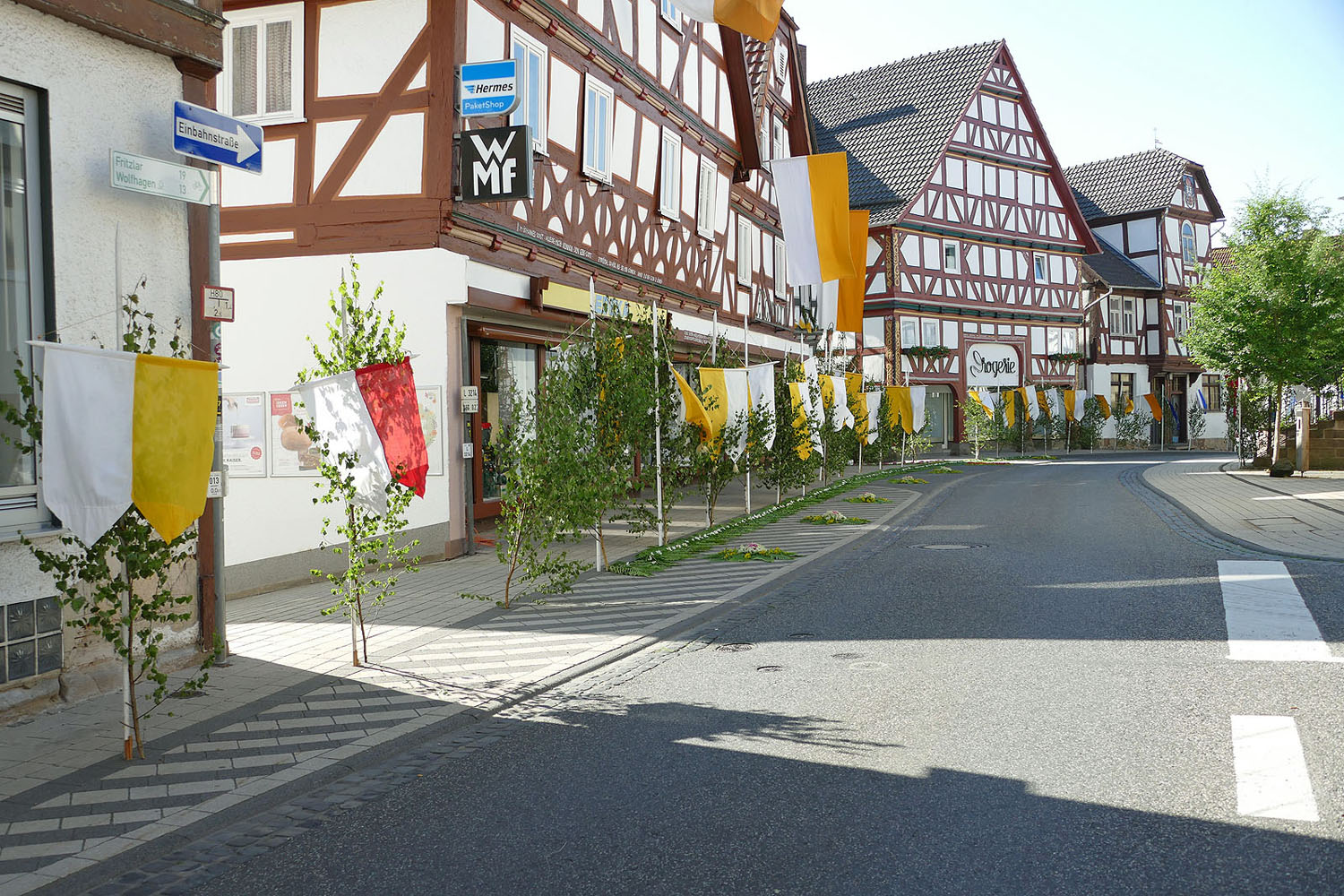 Bei der anschließenden Prozession durch die Straßen der Stadt Naumburg, die mit Büschen, Fahnen und zahlreichen aufgestellten Hausaltären geschmückt waren, nahmen zahlreiche Gemeindemitglieder teil.