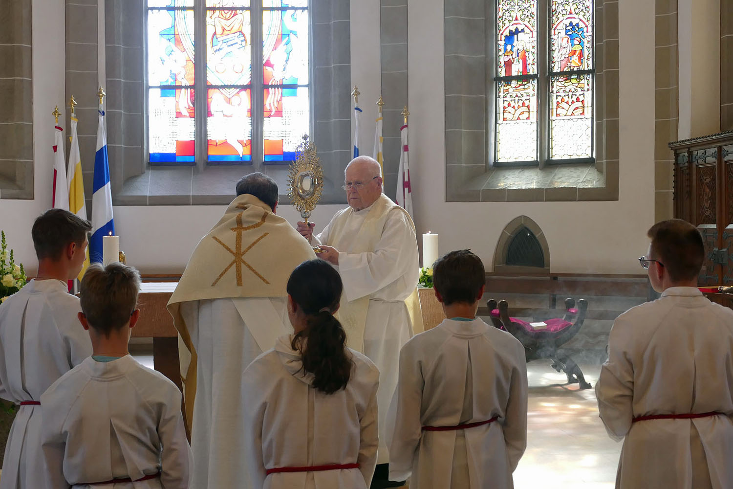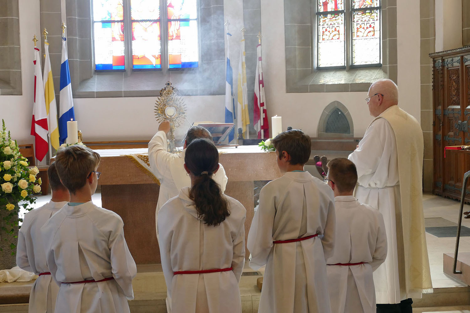 Am Donnerstag, 19. Juni 2025, dem Hochfest des Leibes und Blutes Christi, feierte unsere Kirchengemeinde aus Naumburg das Fronleichnamsfest mit einem feierlichen Hochamt, das vom Geistlichem Rat Stadtpfarrer i.R. Ulrich Trzeciok zelebriert wurde. Mitzelebranten waren Stadtpfarrer Geistlicher Rat W. Johannes Kowal und Diakon Alexander von Rüden.