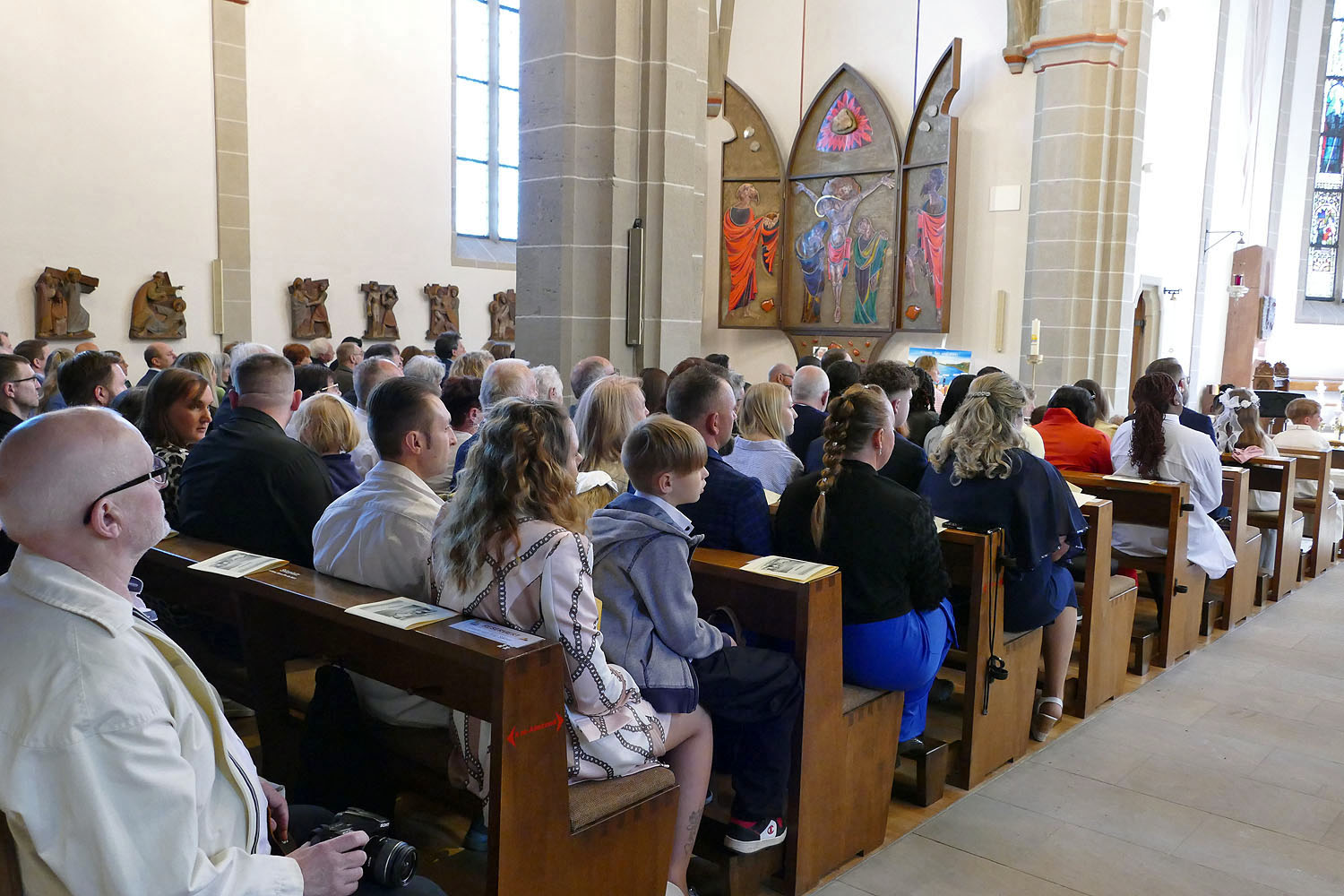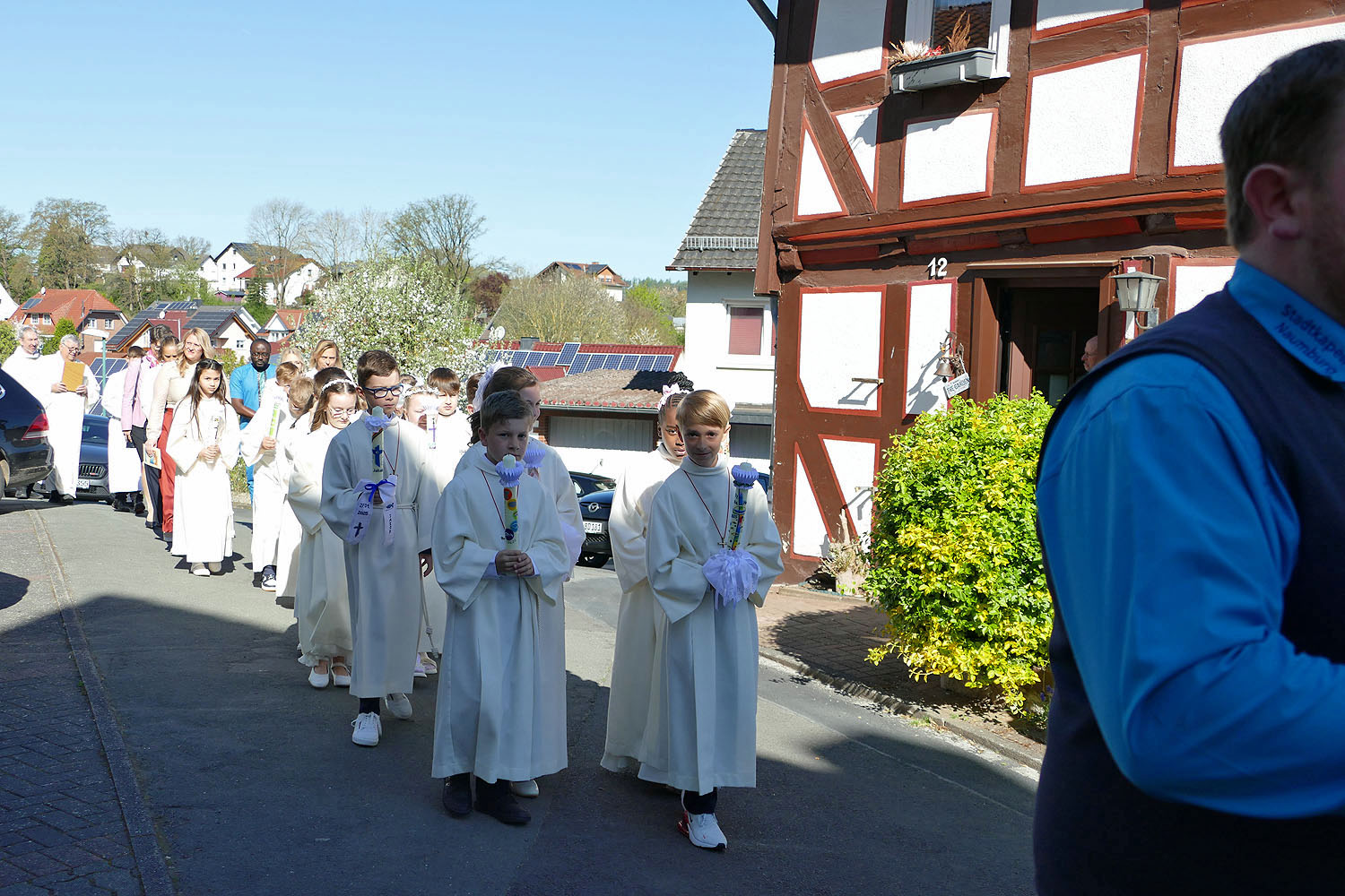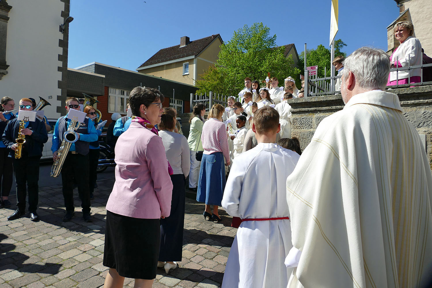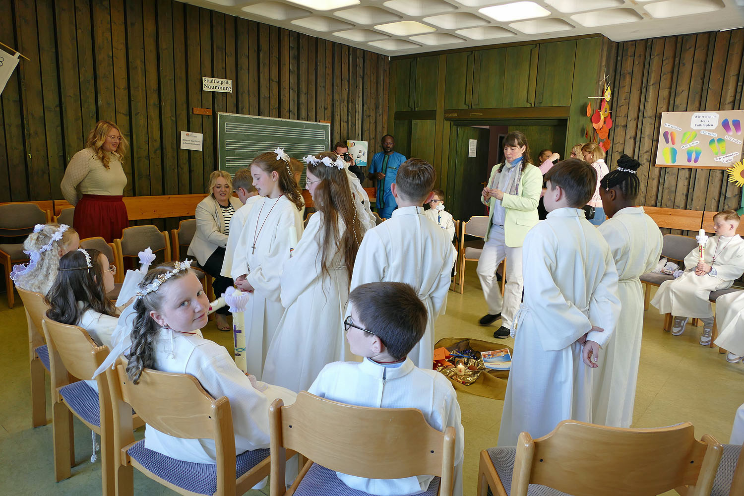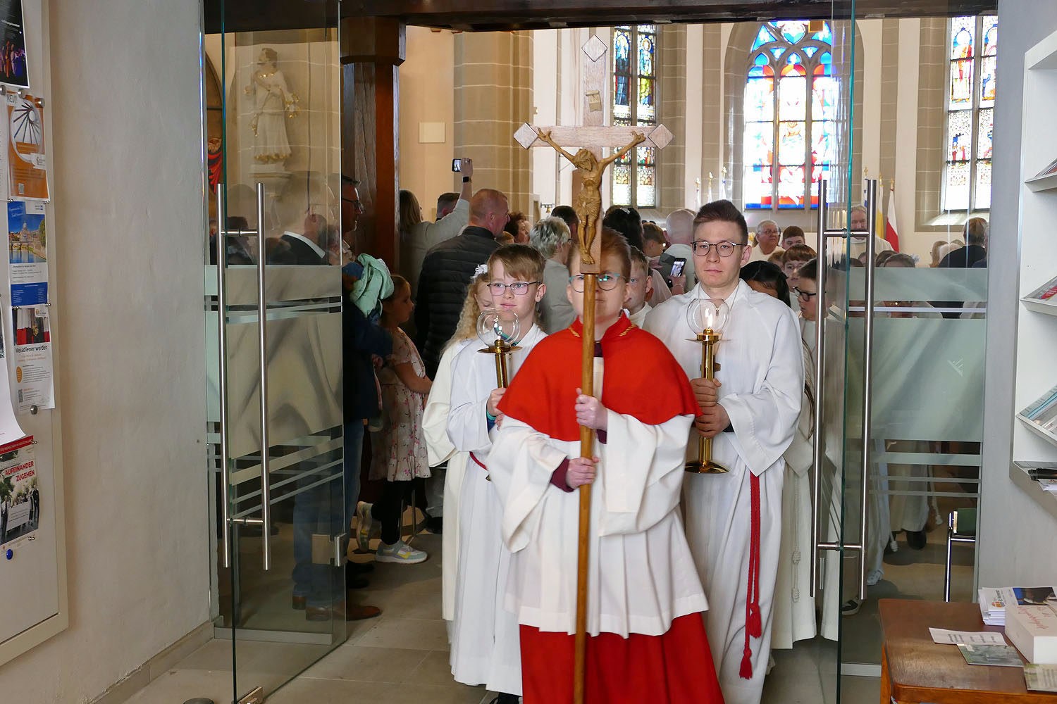 Nachdem die Kommunionkinder im Gemeindezentrum Pater Bonifatius Dux Haus sich für diesen Tag vorbereitet hatten und ihnen ihre Kreuze übergeben wurden, hat sie Pfarrer Fischer mit den Messdienern und der Naumburger Stadtkapelle abgeholt und zogen feierlich in St. Crescentius ein.
