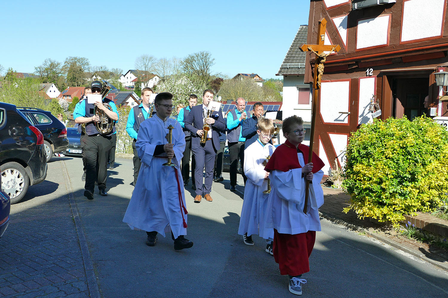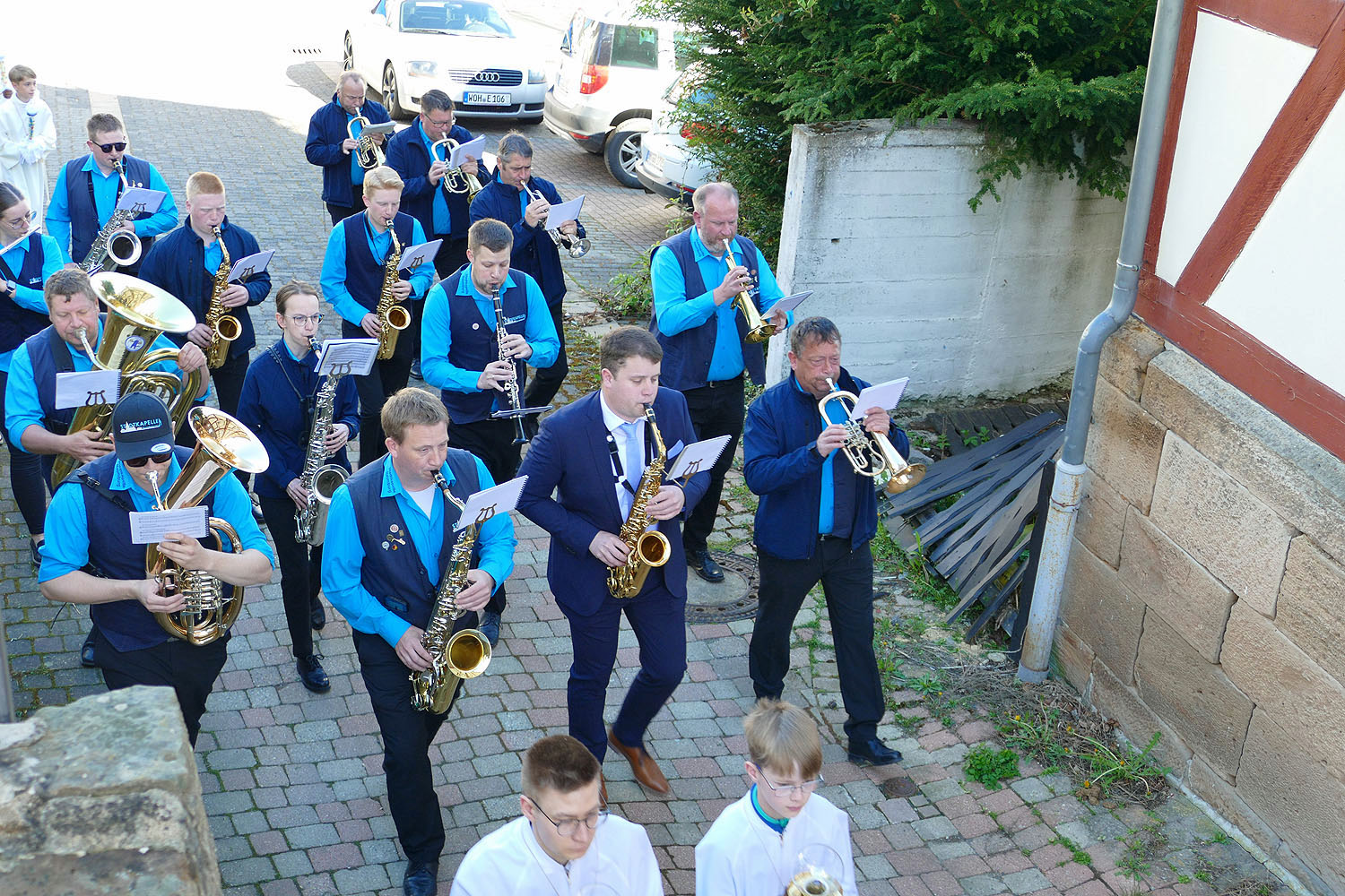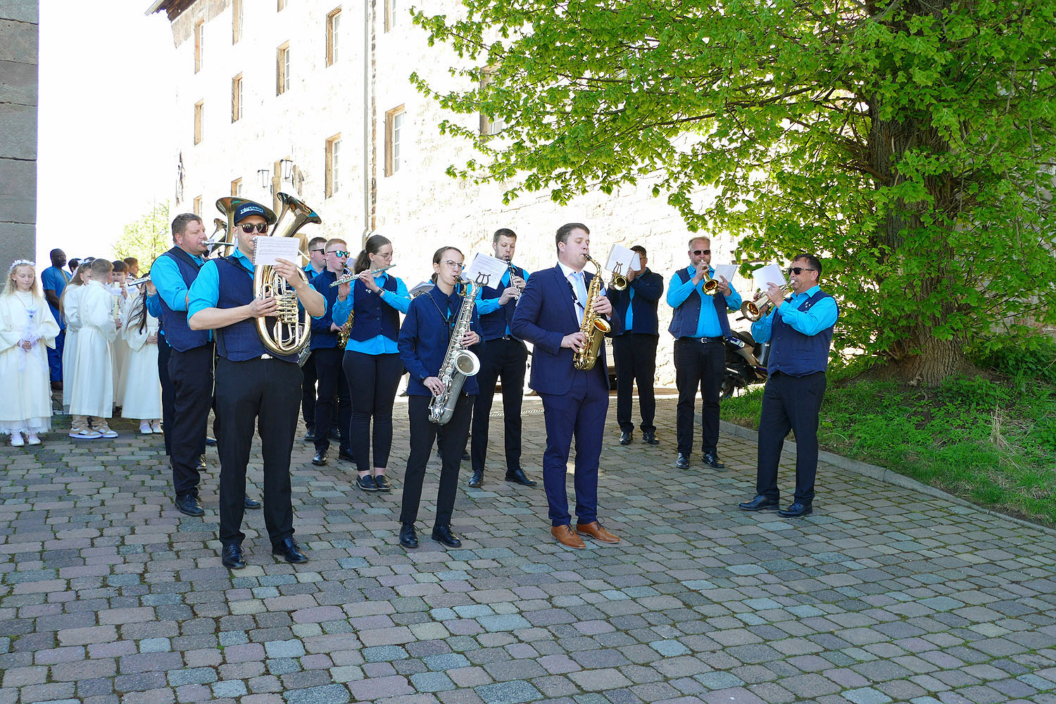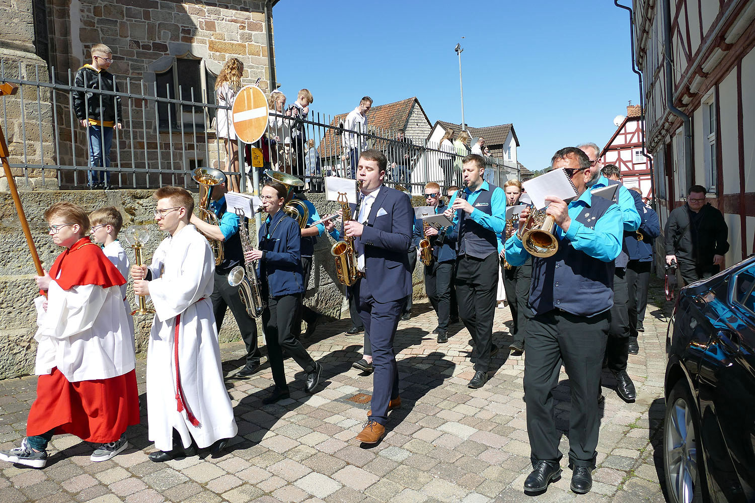 Nachdem die Kommunionkinder im Gemeindezentrum Pater Bonifatius Dux Haus sich für diesen Tag vorbereitet hatten und ihnen ihre Kreuze übergeben wurden, hat sie Pfarrer Fischer mit den Messdienern und der Naumburger Stadtkapelle abgeholt und zogen feierlich in St. Crescentius ein.