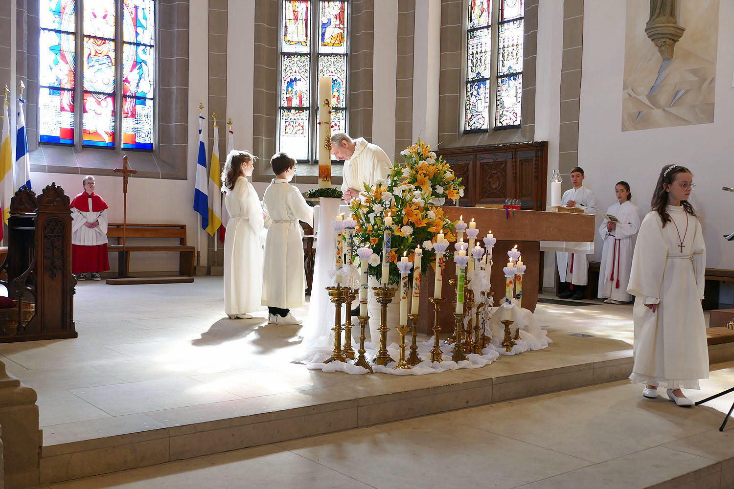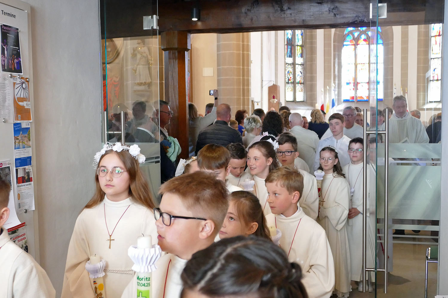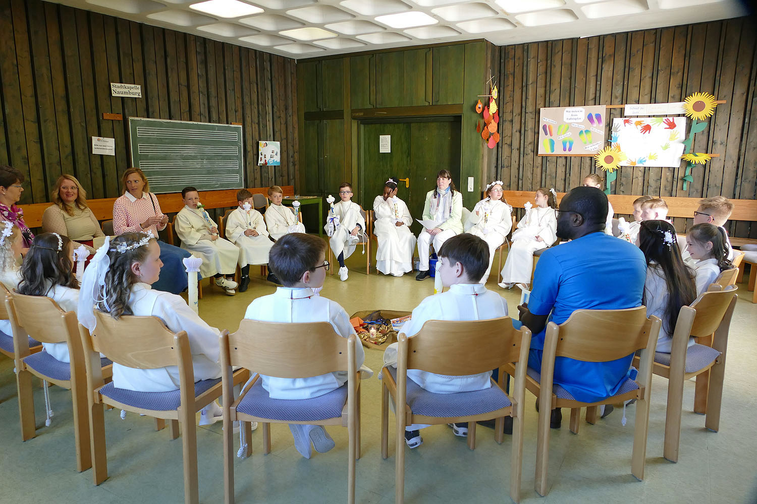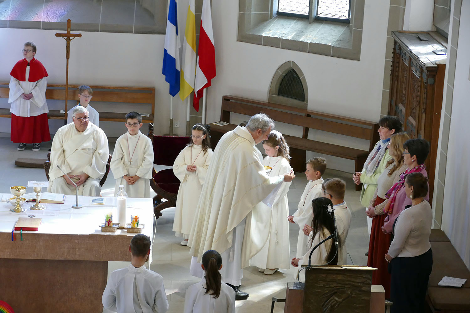 Am Weißen Sonntag, 27. April 2025, konnte Pfarrer Martin Fischer 17 Kommunionkindern aus dem Kirchort Naumburg der Pfarrei St. Heimerad in einem feierlichen Festgottesdienst in der Stadtpfarrkirche in Naumburg das Sakrament der 1. Heiligen Kommunion erteilen.