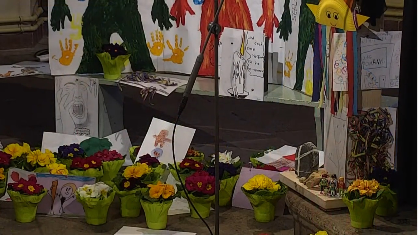 Für jedes Opfer war eine Blume aufgestellt worden, die von allen Betroffenen in den kommenden Tagen in der katholischen und evangelischen Kirche abgeholt werden können. An einer Gedenkstele hatten Kinder und Jugendliche mit Bildern und Basteleien ihre persönliche Erinnerung an die Amokfahrt zum Ausdruck gebracht.