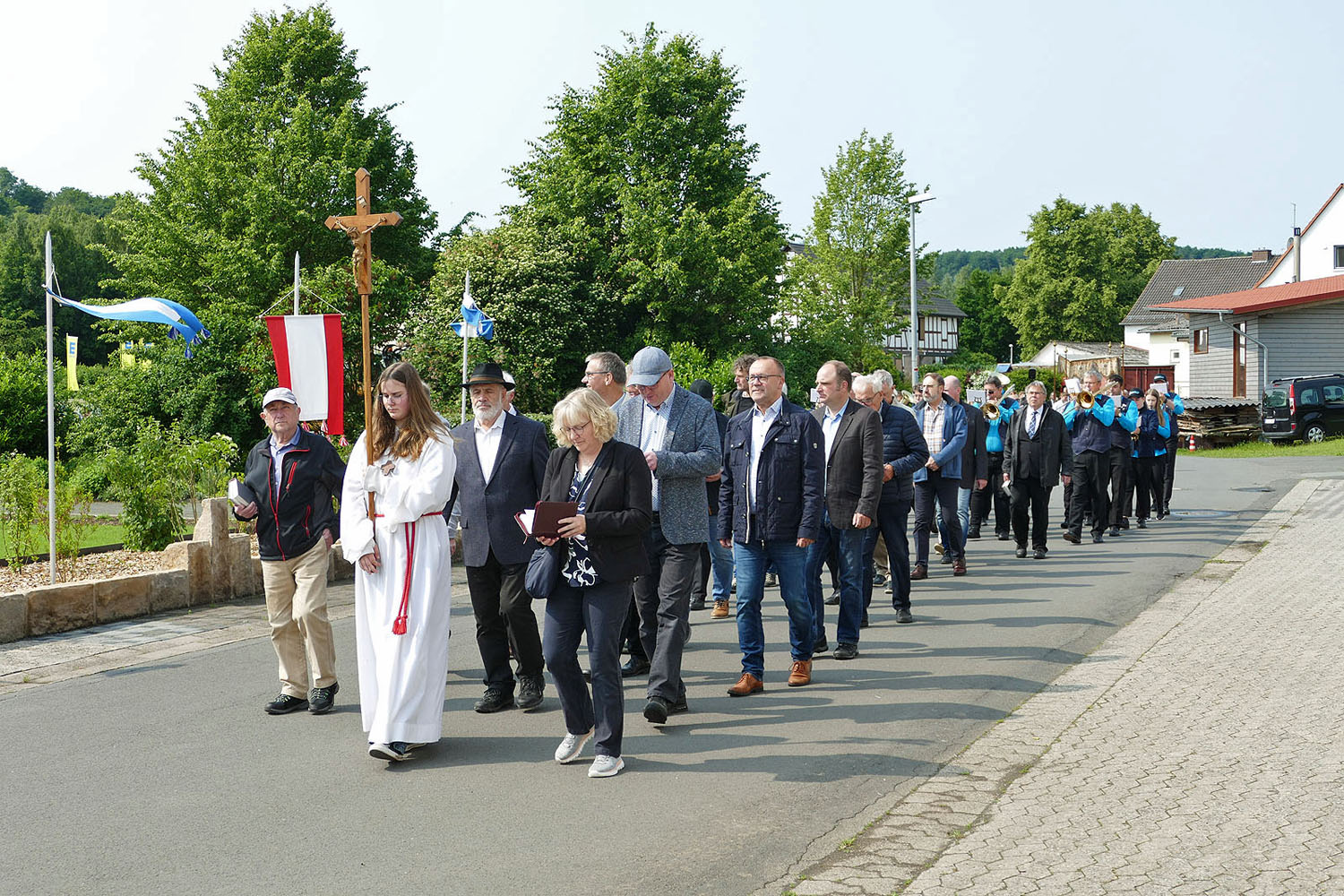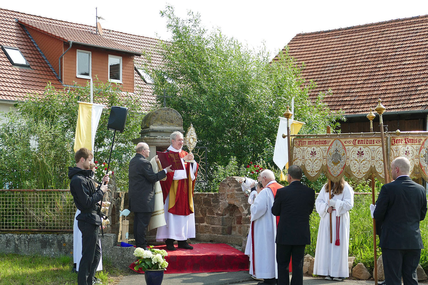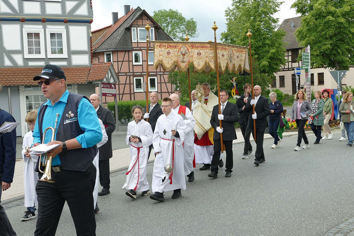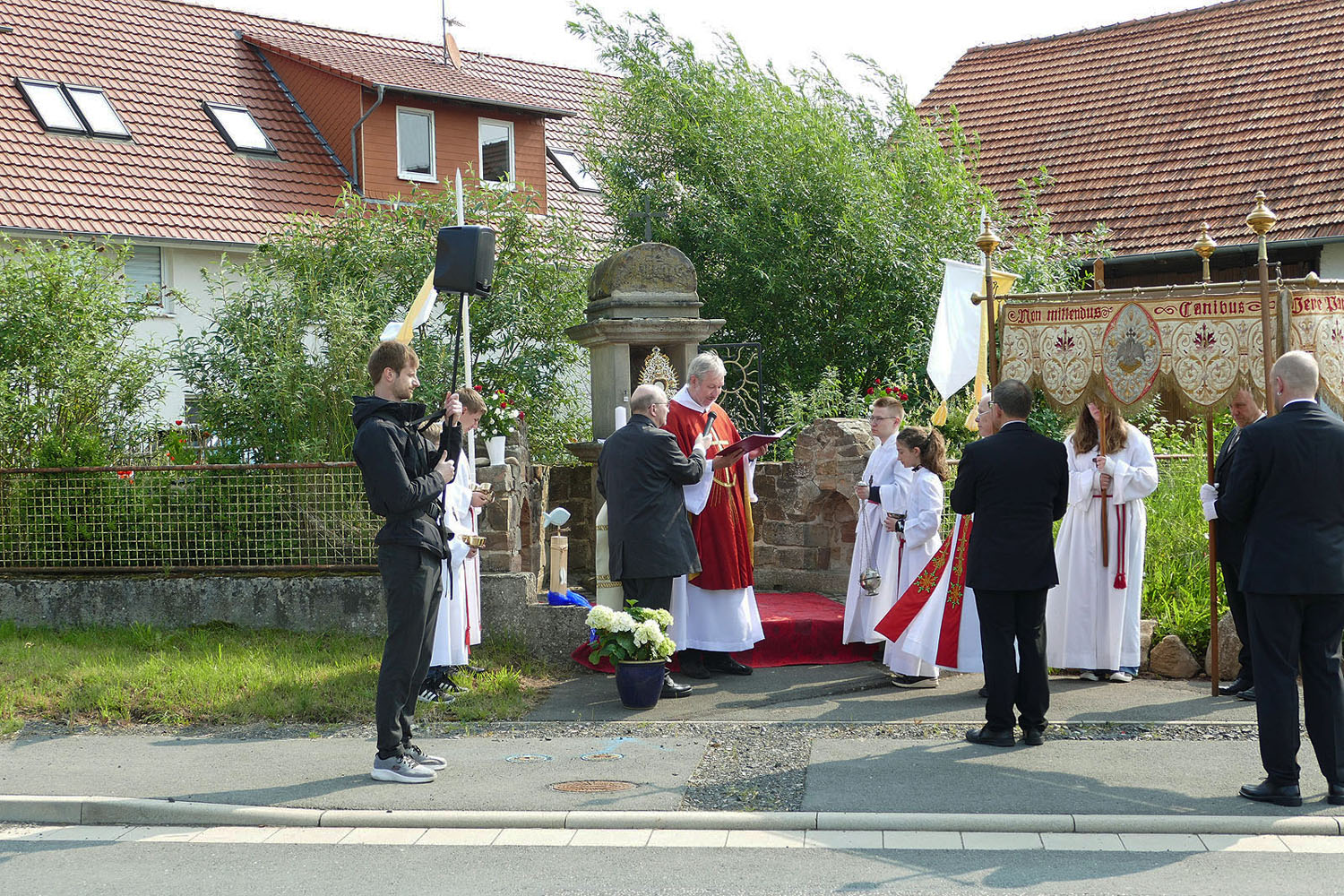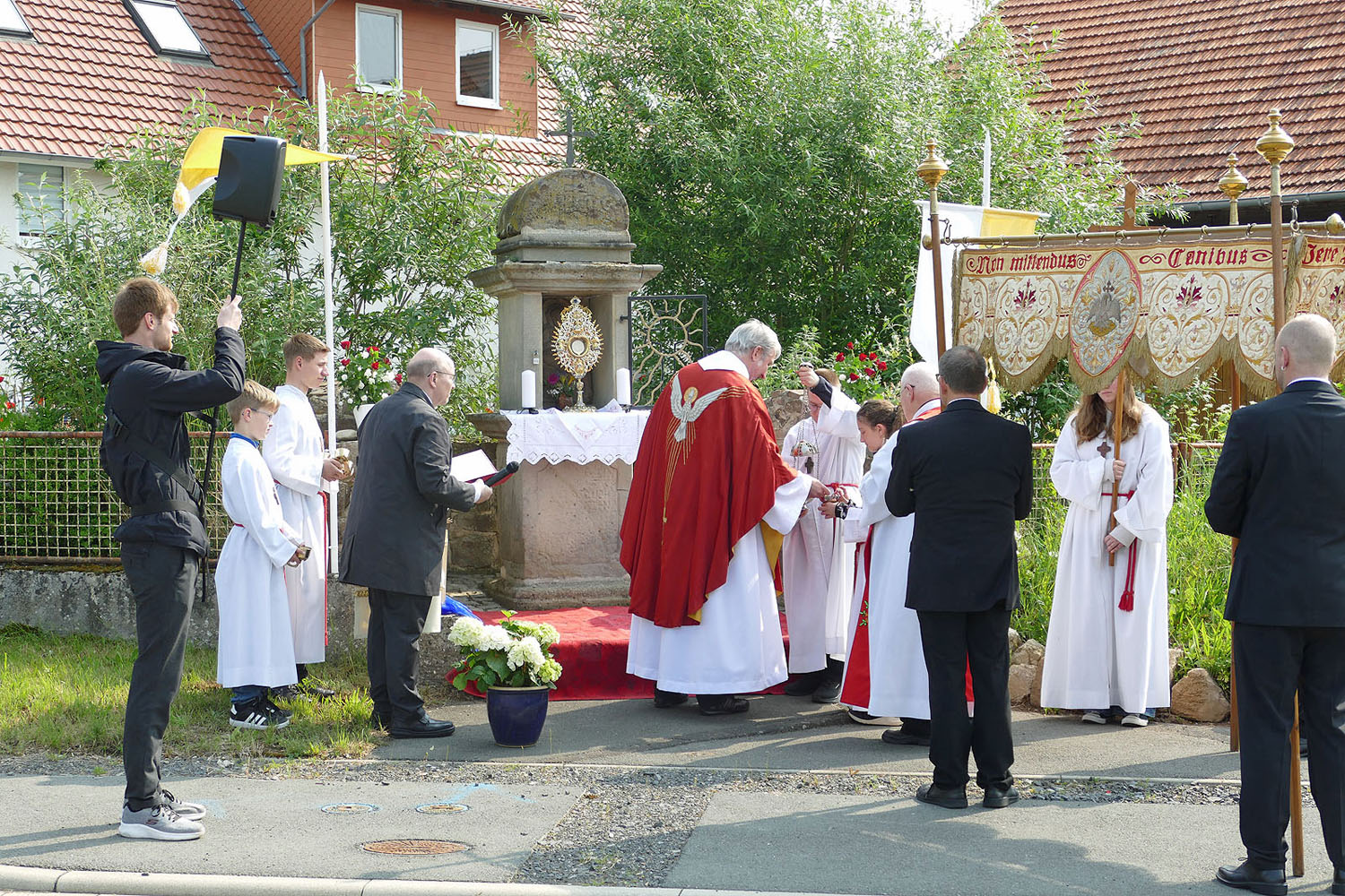 Pfarrer Fischer bedankt sich herzlich bei der Naumburger Stadtkapelle und den Gemeindemitgliedern, die die Altäre für die Prozession geschmückt und aufgestellt hatten.