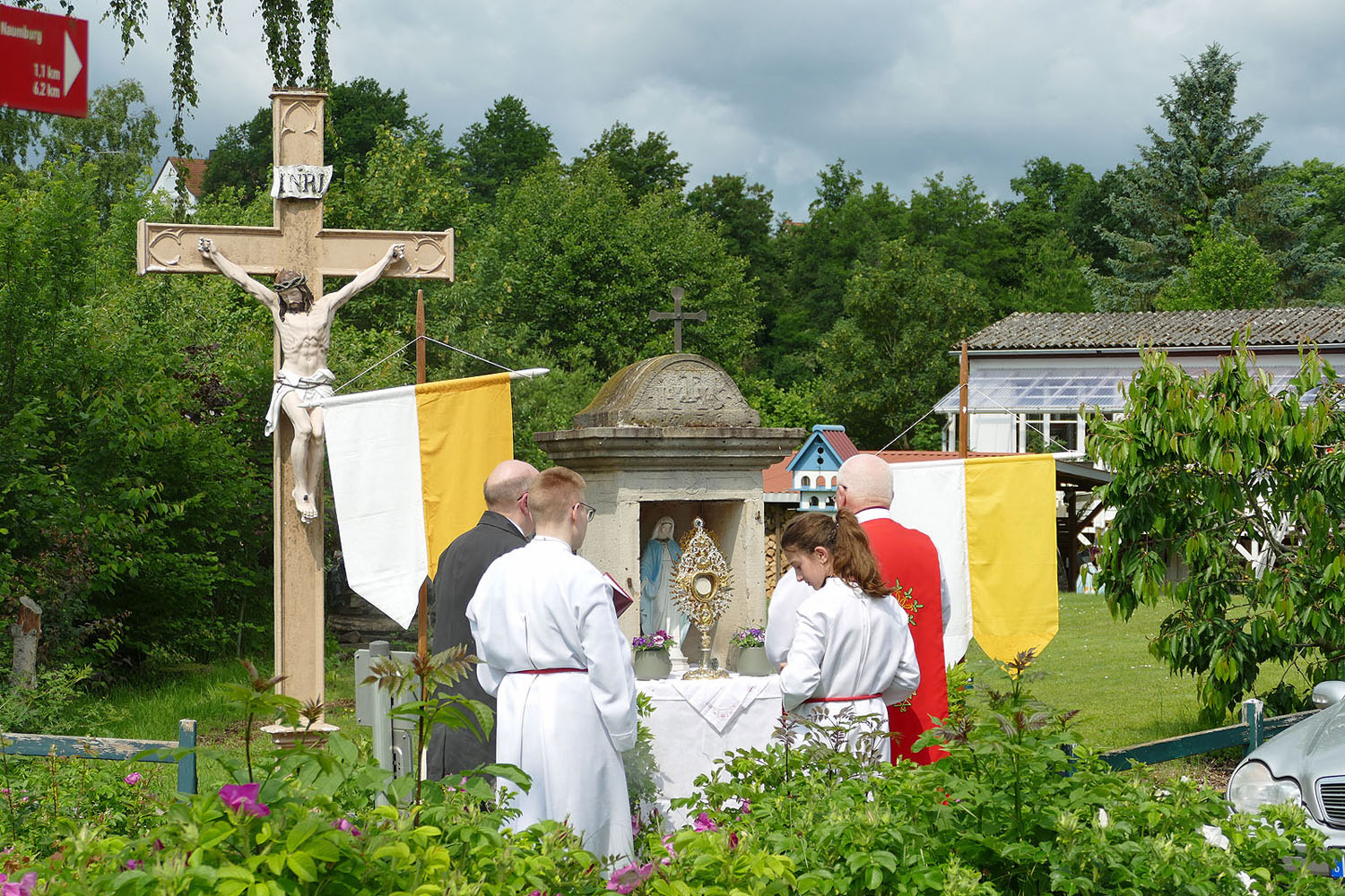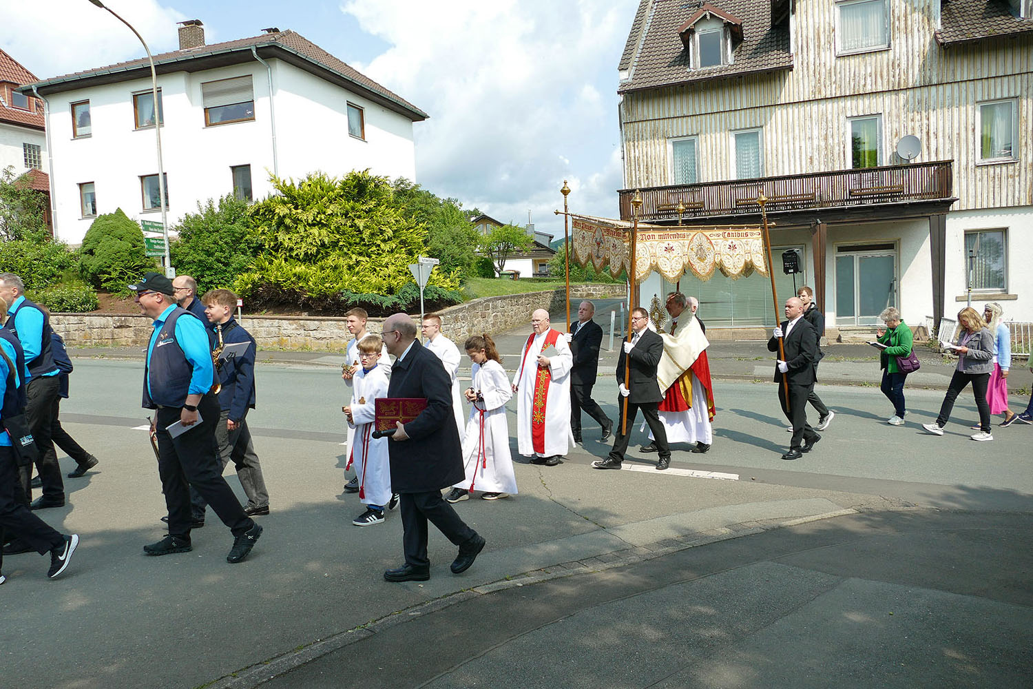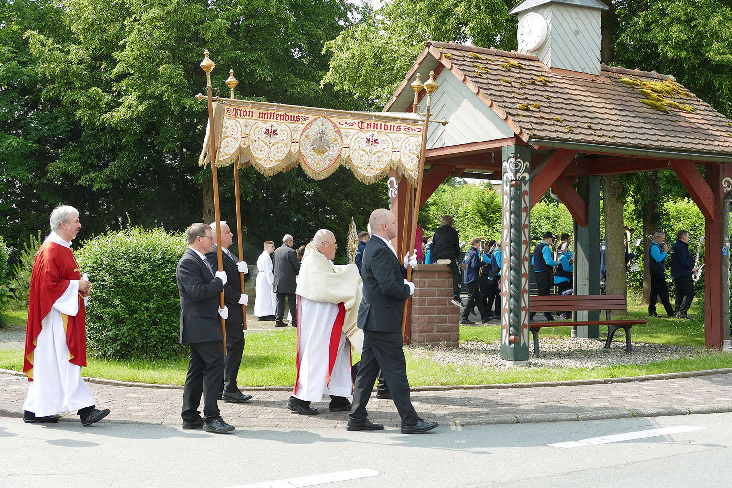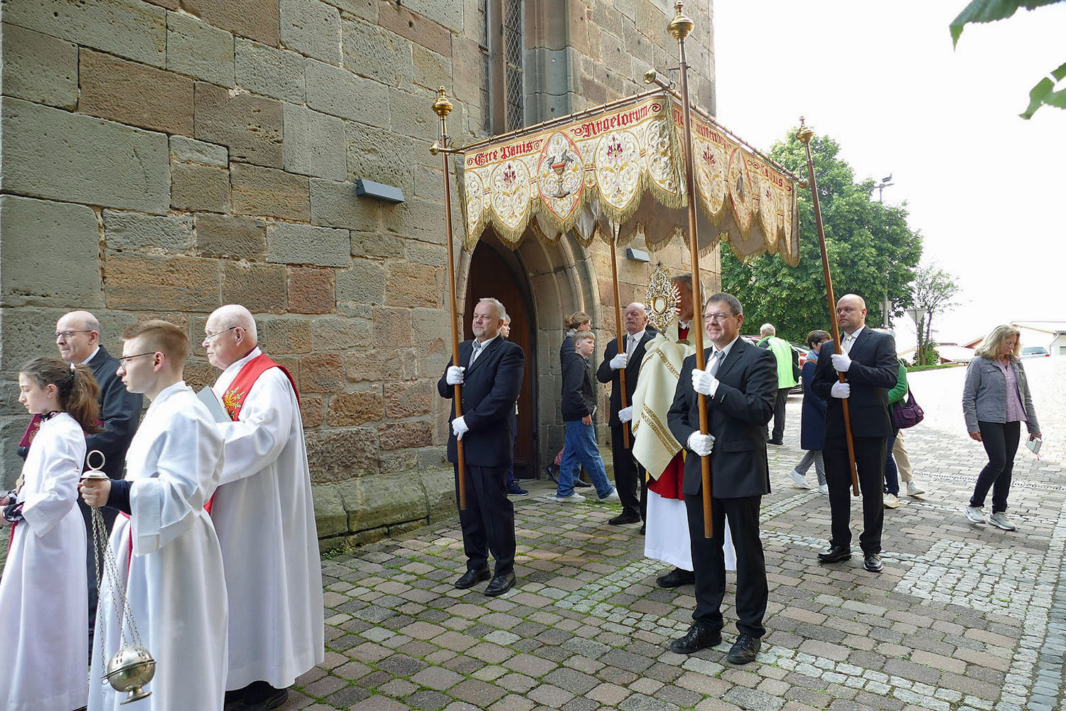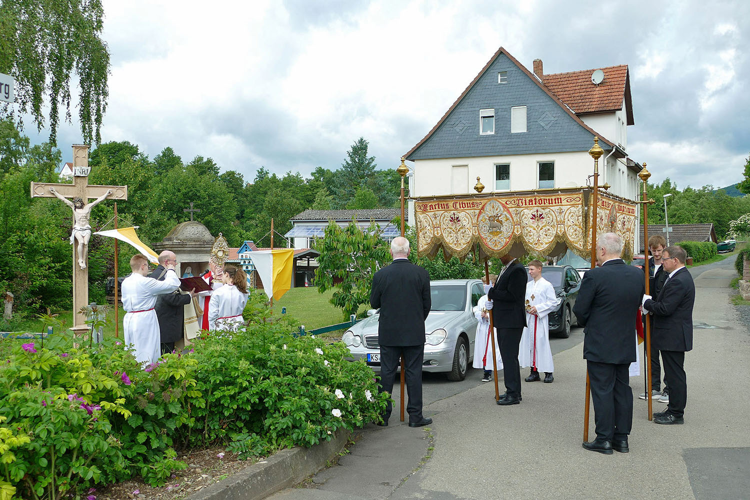 Pfarrer Fischer bedankt sich herzlich bei der Naumburger Stadtkapelle und den Gemeindemitgliedern, die die Altäre für die Prozession geschmückt und aufgestellt hatten.